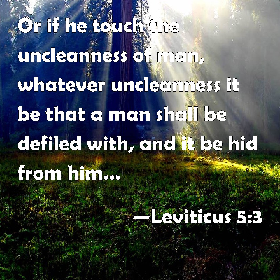 Choose a Background Leviticus 5:3 Or if he touch the uncleanness of man, whatever uncleanness it be that a man shall be defiled with, and it be hid from him; when he knows of it, then he shall be guilty. KJV: Or if he touch the uncleanness of man, whatsoever uncleanness it be that a man shall be defiled withal, and it be hid from him; when he knoweth of it, then he shall be guilty. DRB: And if he touch any thing of the uncleanness of man, according to any uncleanness wherewith he is wont to be defiled, and having forgotten it, come afterwards to know it, he shall be guilty of an offence. DBT: or if he touch the uncleanness of man, any uncleanness of him by which he is defiled, and it be hid from him, when he knoweth it, then he is guilty. ERV: or if he touch the uncleanness of man, whatsoever his uncleanness be wherewith he is unclean, and it be hid from him; when he knoweth of it, then he shall be guilty: WBT: Or if he shall touch the uncleanness of man, whatever uncleanness it may be that a man shall be defiled with, and it be hid from him; when he knoweth of it, then he shall be guilty. WEB: "'Or if he touches the uncleanness of man, whatever his uncleanness is with which he is unclean, and it is hidden from him; when he knows of it, then he shall be guilty. YLT: 'Or when he cometh against uncleanness of man, even any of his uncleanness whereby he is unclean, and it hath been hidden from him, and he hath known, and hath been guilty:Links Leviticus 5:3 NIV • Leviticus 5:3 NLT • Leviticus 5:3 ESV • Leviticus 5:3 NASB • Leviticus 5:3 KJV • Leviticus 5:3 Interlinear • Leviticus 5:3 Commentaries • Leviticus 5:3 Parallel Texts • Leviticus 5:3 Bible Apps • Leviticus 5:3 Parallel • Bible Hub |