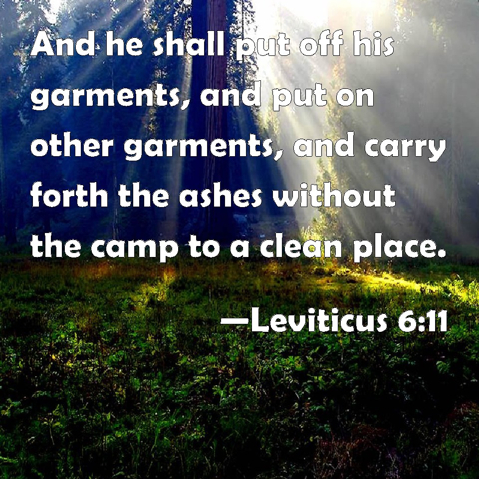 Choose a Background Leviticus 6:11 And he shall put off his garments, and put on other garments, and carry forth the ashes without the camp to a clean place. KJV: And he shall put off his garments, and put on other garments, and carry forth the ashes without the camp unto a clean place. DRB: Shall put off his former vestments, and being clothed with others, shall carry them forth without the camp, and shall cause them to be consumed to dust in a very clean place, DBT: And he shall put off his garments, and put on other garments, and carry forth the ashes without the camp unto a clean place. ERV: And he shall put off his garments, and put on other garments, and carry forth the ashes without the camp unto a clean place. WBT: And he shall put off his garments, and put on other garments, and carry forth the ashes without the camp to a clean place. WEB: He shall take off his garments, and put on other garments, and carry the ashes outside the camp to a clean place. YLT: and he hath stripped off his garments, and hath put on other garments, and hath brought out the ashes unto the outside of the camp, unto a clean place.Links Leviticus 6:11 NIV • Leviticus 6:11 NLT • Leviticus 6:11 ESV • Leviticus 6:11 NASB • Leviticus 6:11 KJV • Leviticus 6:11 Interlinear • Leviticus 6:11 Commentaries • Leviticus 6:11 Parallel Texts • Leviticus 6:11 Bible Apps • Leviticus 6:11 Parallel • Bible Hub |