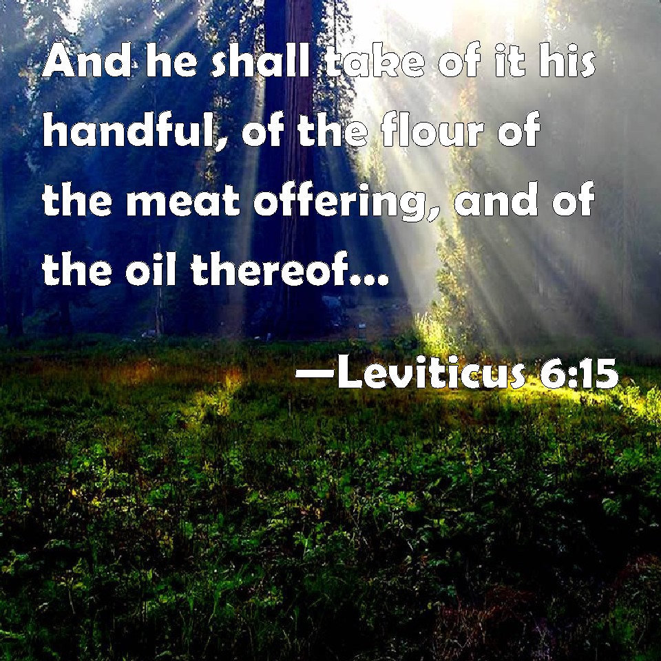 Choose a Background Leviticus 6:15 And he shall take of it his handful, of the flour of the meat offering, and of the oil thereof, and all the frankincense which is on the meat offering, and shall burn it on the altar for a sweet smell, even the memorial of it, to the LORD. KJV: And he shall take of it his handful, of the flour of the meat offering, and of the oil thereof, and all the frankincense which is upon the meat offering, and shall burn it upon the altar for a sweet savour, even the memorial of it, unto the LORD. DRB: The priest shall take a handful of the flour that is tempered with oil, and all the frankincense that is put upon the flour: and he shall burn it on the altar for a memorial of most sweet odour to the Lord: DBT: And he shall take of it his handful of the fine flour of the oblation, and of the oil thereof, and all the frankincense which is on the meat-offering, and shall burn it on the altar: it is a sweet odour of the memorial thereof to Jehovah. ERV: And he shall take up therefrom his handful, of the fine flour of the meal offering, and of the oil thereof, and all the frankincense which is upon the meal offering, and shall burn it upon the altar for a sweet savour, as the memorial thereof, unto the LORD. WBT: And he shall take of it his handful, of the flour of the meat-offering, and of the oil thereof, and all the frankincense which is upon the meat-offering, and shall burn it upon the altar for a sweet savor, even the memorial of it, to the LORD. WEB: He shall take from there his handful of the fine flour of the meal offering, and of its oil, and all the frankincense which is on the meal offering, and shall burn it on the altar for a pleasant aroma, as its memorial, to Yahweh. YLT: and one hath lifted up of it with his hand from the flour of the present, and from its oil, and all the frankincense which is on the present, and hath made perfume on the altar, sweet fragrance — its memorial to Jehovah.Links Leviticus 6:15 NIV • Leviticus 6:15 NLT • Leviticus 6:15 ESV • Leviticus 6:15 NASB • Leviticus 6:15 KJV • Leviticus 6:15 Interlinear • Leviticus 6:15 Commentaries • Leviticus 6:15 Parallel Texts • Leviticus 6:15 Bible Apps • Leviticus 6:15 Parallel • Bible Hub |