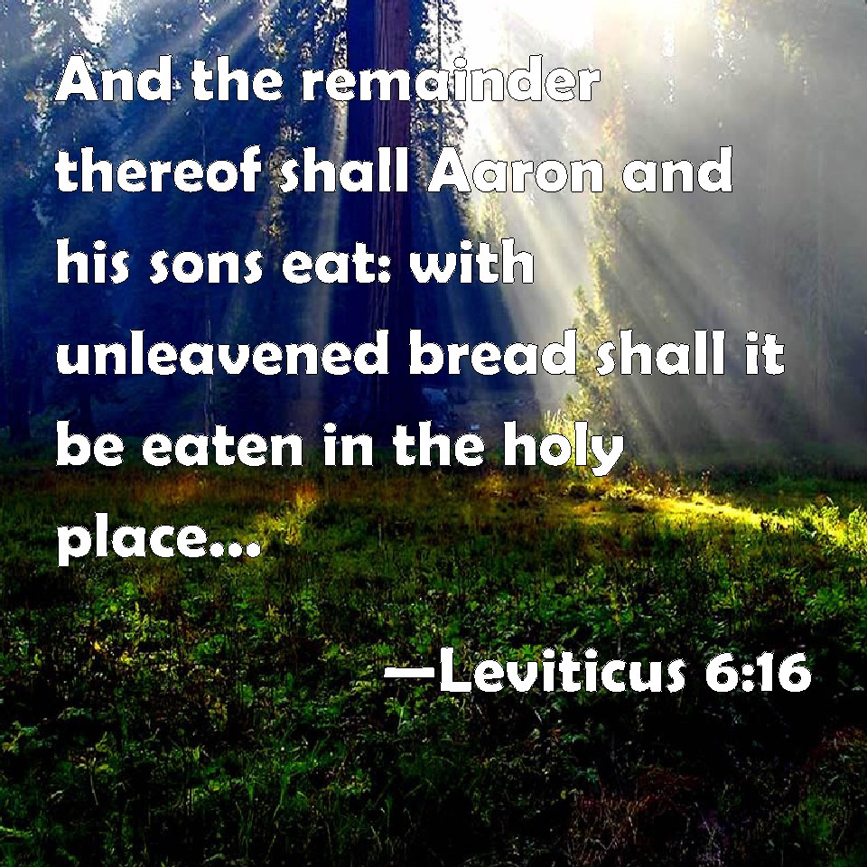 Leviticus 6:16 And the remainder thereof shall Aaron and his sons eat: with unleavened bread shall it be eaten in the holy place; in the court of the tabernacle of the congregation they shall eat it.