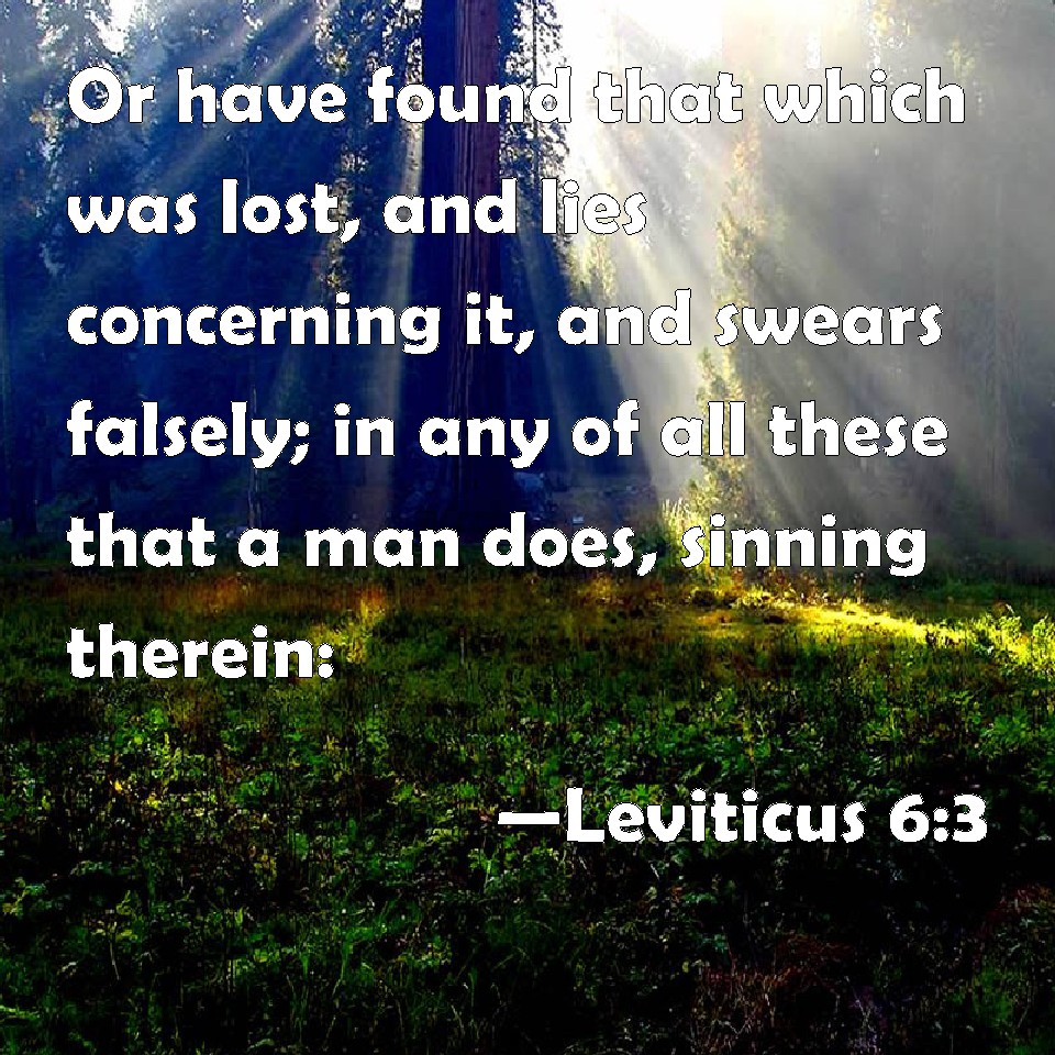 Choose a Background Leviticus 6:3 Or have found that which was lost, and lies concerning it, and swears falsely; in any of all these that a man does, sinning therein: KJV: Or have found that which was lost, and lieth concerning it, and sweareth falsely; in any of all these that a man doeth, sinning therein: DRB: Or shall find a thing lost, and denying it, shall also swear falsely, or shall do any other of the many things, wherein men are wont to sin: DBT: or have found what was lost, and denieth it, and sweareth falsely in anything of all that man doeth, sinning therein; ERV: or have found that which was lost, and deal falsely thereto, and swear to a lie; in any of all these that a man doeth, sinning therein: WBT: Or hath found that which was lost, and lieth concerning it, and sweareth falsely; in any of all these that a man doeth, sinning therein: WEB: or has found that which was lost, and dealt falsely therein, and swearing to a lie; in any of all these things that a man does, sinning therein; YLT: or hath found a lost thing, and hath lied concerning it, and hath sworn to a falsehood, concerning one of all these which man doth, sinning in them:Links Leviticus 6:3 NIV • Leviticus 6:3 NLT • Leviticus 6:3 ESV • Leviticus 6:3 NASB • Leviticus 6:3 KJV • Leviticus 6:3 Interlinear • Leviticus 6:3 Commentaries • Leviticus 6:3 Parallel Texts • Leviticus 6:3 Bible Apps • Leviticus 6:3 Parallel • Bible Hub |