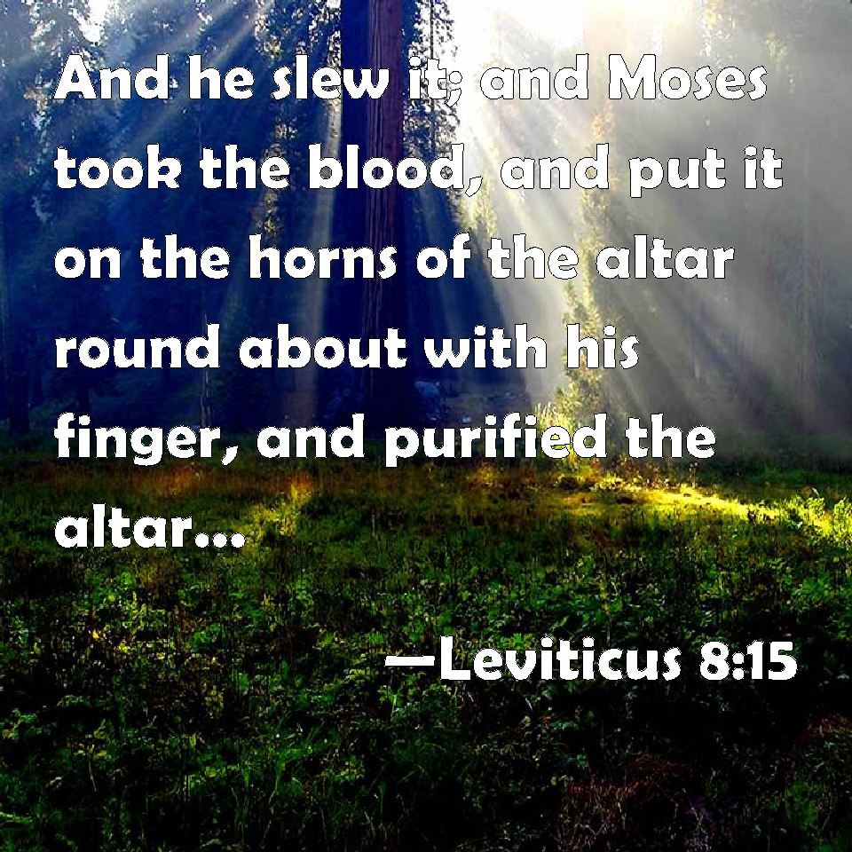 Choose a Background Leviticus 8:15 And he slew it; and Moses took the blood, and put it on the horns of the altar round about with his finger, and purified the altar, and poured the blood at the bottom of the altar, and sanctified it, to make reconciliation on it. KJV: And he slew it; and Moses took the blood, and put it upon the horns of the altar round about with his finger, and purified the altar, and poured the blood at the bottom of the altar, and sanctified it, to make reconciliation upon it. DRB: He immolated it: and took the blood, and dipping his finger in it, he touched the horns of the altar round about. Which being expiated, and sanctified, he poured the rest of the blood at the bottom thereof. DBT: and he slaughtered it, and Moses took the blood, and put it on the horns of the altar round about with his finger, and cleansed the altar from sin, and the blood he poured at the bottom of the altar, and hallowed it, making atonement for it. ERV: And he slew it; and Moses took the blood, and put it upon the horns of the altar round about with his finger, and purified the altar, and poured out the blood at the base of the altar, and sanctified it, to make atonement for it. WBT: And he slew it; and Moses took the blood, and put it upon the horns of the altar round about with his finger, and purified the altar, and poured the blood at the bottom of the altar, and sanctified it, to make reconciliation upon it. WEB: He killed it; and Moses took the blood, and put it around on the horns of the altar with his finger, and purified the altar, and poured out the blood at the base of the altar, and sanctified it, to make atonement for it. YLT: and one slaughtereth, and Moses taketh the blood, and putteth on the horns of the altar round about with his finger, and cleanseth the altar, and the blood he hath poured out at the foundation of the altar, and sanctifieth it, to make atonement upon it.Links Leviticus 8:15 NIV • Leviticus 8:15 NLT • Leviticus 8:15 ESV • Leviticus 8:15 NASB • Leviticus 8:15 KJV • Leviticus 8:15 Interlinear • Leviticus 8:15 Commentaries • Leviticus 8:15 Parallel Texts • Leviticus 8:15 Bible Apps • Leviticus 8:15 Parallel • Bible Hub |