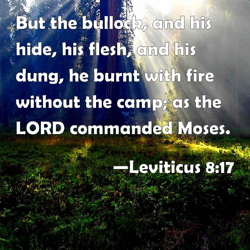 Choose a Background Leviticus 8:17 But the bullock, and his hide, his flesh, and his dung, he burnt with fire without the camp; as the LORD commanded Moses. KJV: But the bullock, and his hide, his flesh, and his dung, he burnt with fire without the camp; as the LORD commanded Moses. DRB: And the calf with the skin, and the flesh and the dung, he burnt without the camp, as the Lord had commanded. DBT: And the bullock, and its skin, and its flesh, and its dung he burned with fire outside the camp, as Jehovah had commanded Moses. ERV: But the bullock, and its skin, and its flesh, and its dung, he burnt with fire without the camp; as the LORD commanded Moses. WBT: But the bullock, and his hide, his flesh, and his dung, he burnt with fire without the camp; as the LORD commanded Moses. WEB: But the bull, and its skin, and its flesh, and its dung, he burned with fire outside the camp; as Yahweh commanded Moses. YLT: and the bullock, and its skin, and its flesh, and its dung, he hath burnt with fire, at the outside of the camp, as Jehovah hath commanded Moses.Links Leviticus 8:17 NIV • Leviticus 8:17 NLT • Leviticus 8:17 ESV • Leviticus 8:17 NASB • Leviticus 8:17 KJV • Leviticus 8:17 Interlinear • Leviticus 8:17 Commentaries • Leviticus 8:17 Parallel Texts • Leviticus 8:17 Bible Apps • Leviticus 8:17 Parallel • Bible Hub |