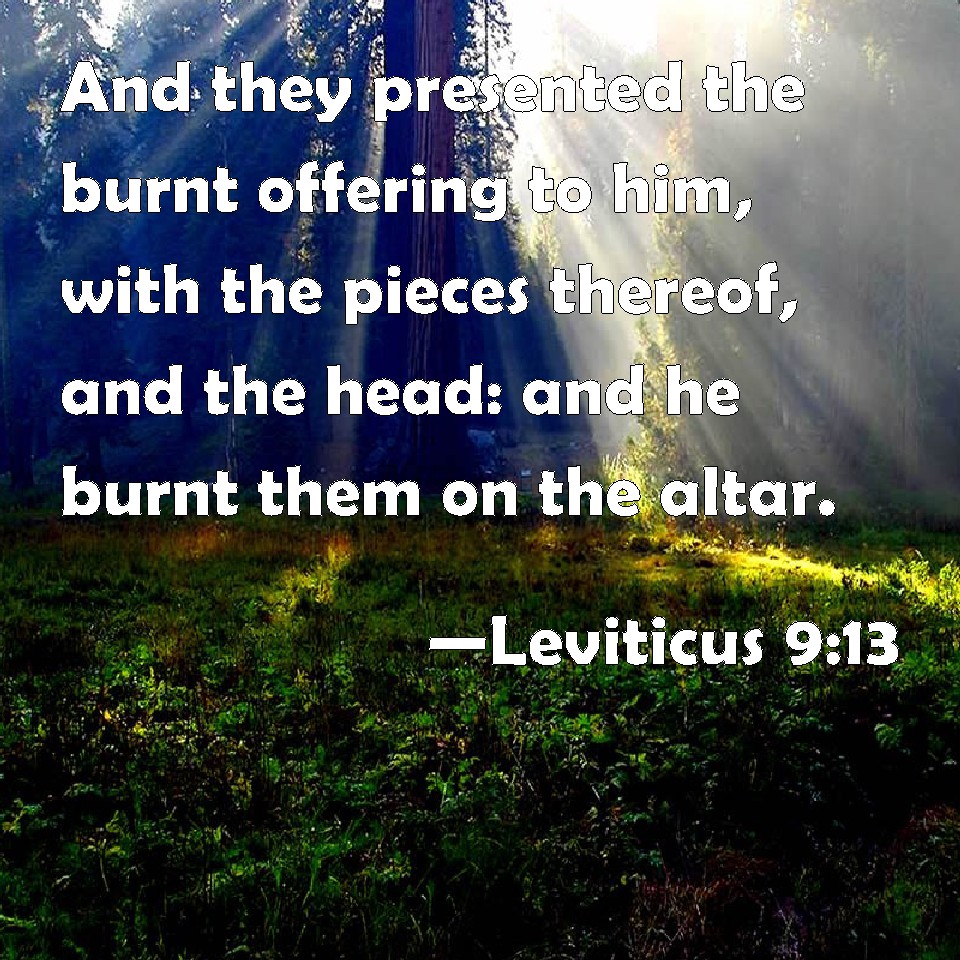 Choose a Background Leviticus 9:13 And they presented the burnt offering to him, with the pieces thereof, and the head: and he burnt them on the altar. KJV: And they presented the burnt offering unto him, with the pieces thereof, and the head: and he burnt them upon the altar. DRB: And the victim being cut into pieces, they brought to him the head and all the members, all which he burnt with fire upon the altar, DBT: And they delivered the burnt-offering to him, in the pieces thereof, and the head; and he burned them on the altar. ERV: And they delivered the burnt offering unto him, piece by piece, and the head: and he burnt them upon the altar. WBT: And they presented the burnt-offering to him, with the pieces of it, and the head: and he burnt them upon the altar. WEB: They delivered the burnt offering to him, piece by piece, and the head: and he burned them upon the altar. YLT: and the burnt-offering they have presented unto him, by its pieces, and the head, and he maketh perfume on the altar;Links Leviticus 9:13 NIV • Leviticus 9:13 NLT • Leviticus 9:13 ESV • Leviticus 9:13 NASB • Leviticus 9:13 KJV • Leviticus 9:13 Interlinear • Leviticus 9:13 Commentaries • Leviticus 9:13 Parallel Texts • Leviticus 9:13 Bible Apps • Leviticus 9:13 Parallel • Bible Hub |