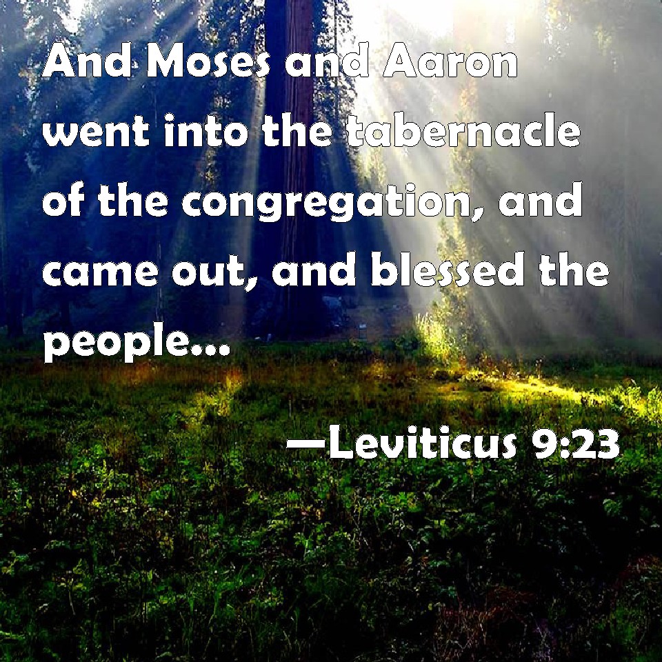 Choose a Background Leviticus 9:23 And Moses and Aaron went into the tabernacle of the congregation, and came out, and blessed the people: and the glory of the LORD appeared to all the people. KJV: And Moses and Aaron went into the tabernacle of the congregation, and came out, and blessed the people: and the glory of the LORD appeared unto all the people. DRB: And Moses and Aaron went into the tabernacle of the testimony, and afterwards came forth and blessed the people. And the glory of the Lord appeared to all the multitude: DBT: And Moses and Aaron went into the tent of meeting, and came out and blessed the people; and the glory of Jehovah appeared to all the people. ERV: And Moses and Aaron went into the tent of meeting, and came out, and blessed the people: and the glory of the LORD appeared unto all the people. WBT: And Moses and Aaron went into the tabernacle of the congregation, and came out, and blessed the people: and the glory of the LORD appeared to all the people. WEB: Moses and Aaron went into the Tent of Meeting, and came out, and blessed the people: and the glory of Yahweh appeared to all the people. YLT: And Moses goeth in — Aaron also — unto the tent of meeting, and they come out, and bless the people, and the honour of Jehovah appeareth unto all the people;Links Leviticus 9:23 NIV • Leviticus 9:23 NLT • Leviticus 9:23 ESV • Leviticus 9:23 NASB • Leviticus 9:23 KJV • Leviticus 9:23 Interlinear • Leviticus 9:23 Commentaries • Leviticus 9:23 Parallel Texts • Leviticus 9:23 Bible Apps • Leviticus 9:23 Parallel • Bible Hub |