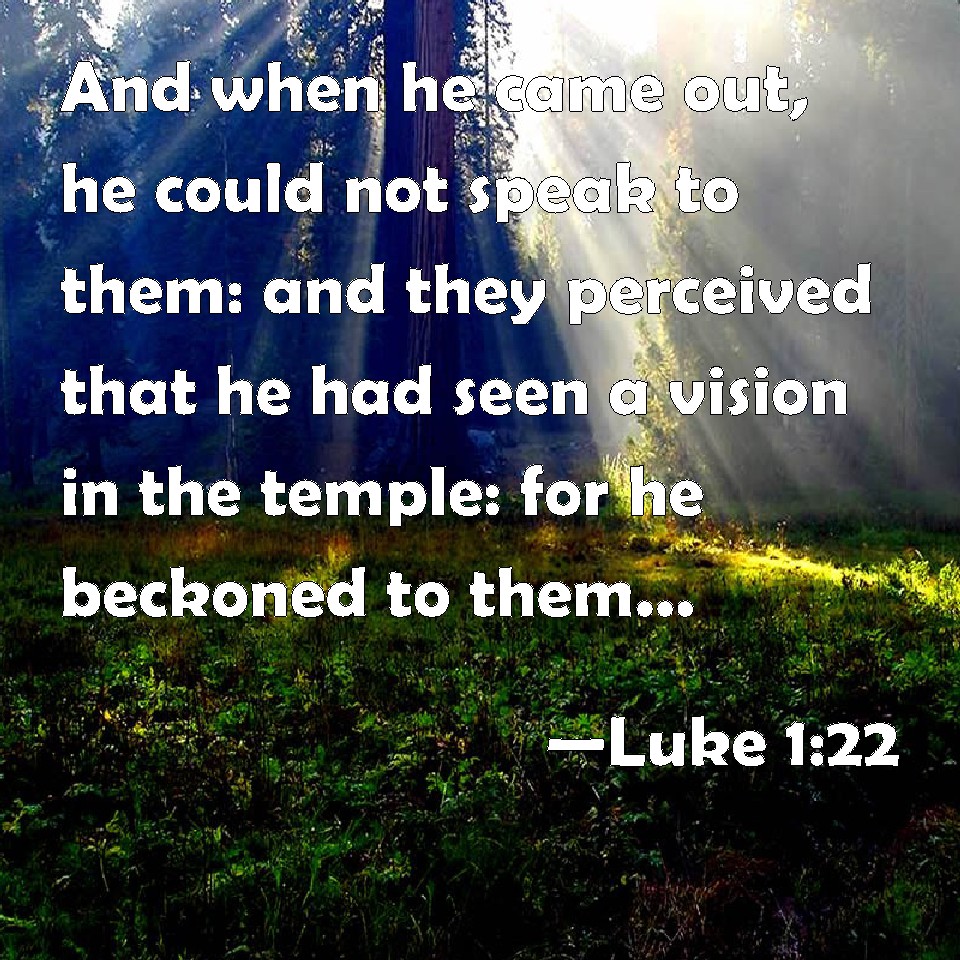 Choose a Background Luke 1:22 And when he came out, he could not speak to them: and they perceived that he had seen a vision in the temple: for he beckoned to them, and remained speechless. KJV: And when he came out, he could not speak unto them: and they perceived that he had seen a vision in the temple: for he beckoned unto them, and remained speechless. DRB: And when he came out, he could not speak to them: and they understood that he had seen a vision in the temple. And he made signs to them, and remained dumb. DBT: But when he came out he could not speak to them, and they recognised that he had seen a vision in the temple. And he was making signs to them, and continued dumb. ERV: And when he came out, he could not speak unto them: and they perceived that he had seen a vision in the temple: and he continued making signs unto them, and remained dumb. WBT: And when he came out, he could not speak to them: and they perceived that he had seen a vision in the temple; for he beckoned to them, and remained speechless. WEB: When he came out, he could not speak to them, and they perceived that he had seen a vision in the temple. He continued making signs to them, and remained mute. YLT: and having come out, he was not able to speak to them, and they perceived that a vision he had seen in the sanctuary, and he was beckoning to them, and did remain dumb.Links Luke 1:22 NIV • Luke 1:22 NLT • Luke 1:22 ESV • Luke 1:22 NASB • Luke 1:22 KJV • Luke 1:22 Interlinear • Luke 1:22 Commentaries • Luke 1:22 Parallel Texts • Luke 1:22 Bible Apps • Luke 1:22 Parallel • Bible Hub |