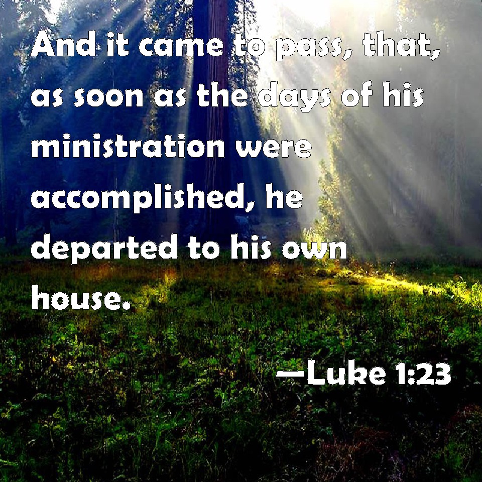 Choose a Background Luke 1:23 And it came to pass, that, as soon as the days of his ministration were accomplished, he departed to his own house. KJV: And it came to pass, that, as soon as the days of his ministration were accomplished, he departed to his own house. DRB: And it came to pass, after the days of his office were accomplished, he departed to his own house. DBT: And it came to pass, when the days of his service were completed, he departed to his house. ERV: And it came to pass, when the days of his ministration were fulfilled, he departed unto his house. WBT: And it came to pass, that as soon as the days of his ministration were accomplished, he departed to his own house. WEB: It happened, when the days of his service were fulfilled, he departed to his house. YLT: And it came to pass, when the days of his service were fulfilled, he went away to his house,Links Luke 1:23 NIV • Luke 1:23 NLT • Luke 1:23 ESV • Luke 1:23 NASB • Luke 1:23 KJV • Luke 1:23 Interlinear • Luke 1:23 Commentaries • Luke 1:23 Parallel Texts • Luke 1:23 Bible Apps • Luke 1:23 Parallel • Bible Hub |