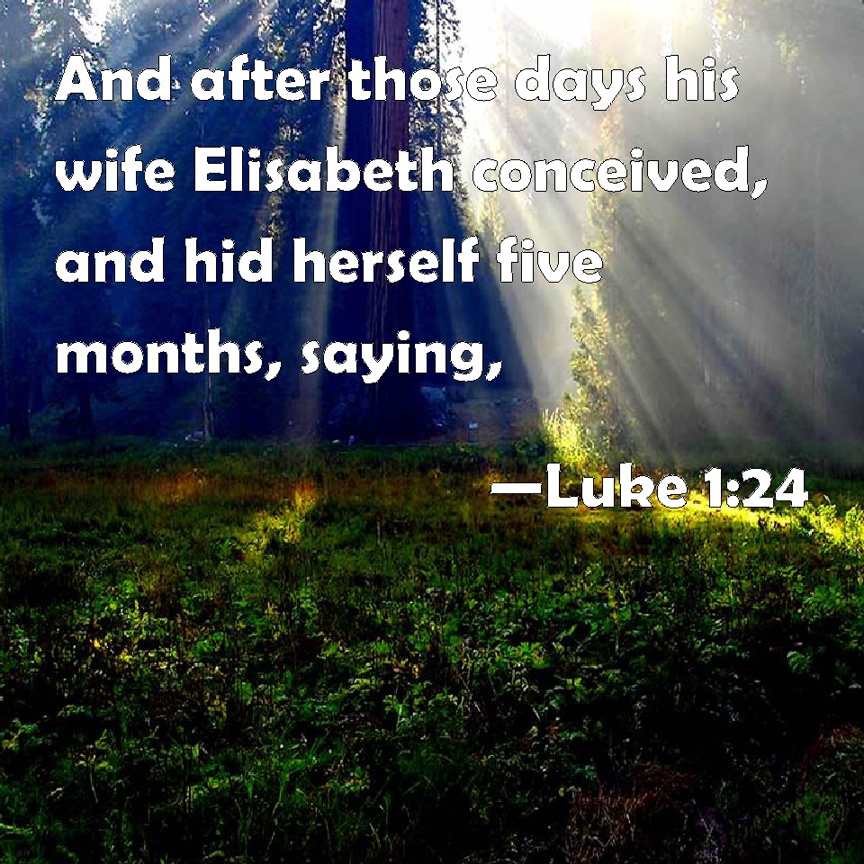 Choose a Background Luke 1:24 And after those days his wife Elisabeth conceived, and hid herself five months, saying, KJV: And after those days his wife Elisabeth conceived, and hid herself five months, saying, DRB: And after those days, Elizabeth his wife conceived, and hid herself five months, saying: DBT: Now after these days, Elizabeth his wife conceived, and hid herself five months, saying, ERV: And after these days Elisabeth his wife conceived; and she hid herself five months, saying, WBT: And after those days his wife Elisabeth conceived, and secluded herself five months, saying, WEB: After these days Elizabeth, his wife, conceived, and she hid herself five months, saying, YLT: and after those days, his wife Elisabeth conceived, and hid herself five months, saying — Links Luke 1:24 NIV • Luke 1:24 NLT • Luke 1:24 ESV • Luke 1:24 NASB • Luke 1:24 KJV • Luke 1:24 Interlinear • Luke 1:24 Commentaries • Luke 1:24 Parallel Texts • Luke 1:24 Bible Apps • Luke 1:24 Parallel • Bible Hub |