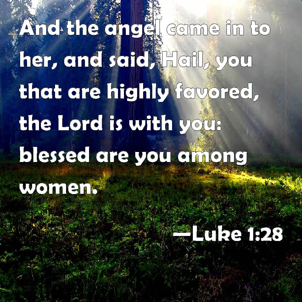 Choose a Background Luke 1:28 And the angel came in to her, and said, Hail, you that are highly favored, the Lord is with you: blessed are you among women. KJV: And the angel came in unto her, and said, Hail, thou that art highly favoured, the Lord is with thee: blessed art thou among women. DRB: And the angel being come in, said unto her: Hail, full of grace, the Lord is with thee: blessed art thou among women. DBT: And the angel came in to her, and said, Hail, thou favoured one! the Lord is with thee: blessed art thou amongst women. ERV: And he came in unto her, and said, Hail, thou that art highly favoured, the Lord is with thee. WBT: And the angel came to her, and said, Hail, thou that art highly favored, the Lord is with thee: blessed art thou among women. WEB: Having come in, the angel said to her, "Rejoice, you highly favored one! The Lord is with you. Blessed are you among women!" YLT: And the messenger having come in unto her, said, 'Hail, favoured one, the Lord is with thee; blessed art thou among women;'Links Luke 1:28 NIV • Luke 1:28 NLT • Luke 1:28 ESV • Luke 1:28 NASB • Luke 1:28 KJV • Luke 1:28 Interlinear • Luke 1:28 Commentaries • Luke 1:28 Parallel Texts • Luke 1:28 Bible Apps • Luke 1:28 Parallel • Bible Hub |