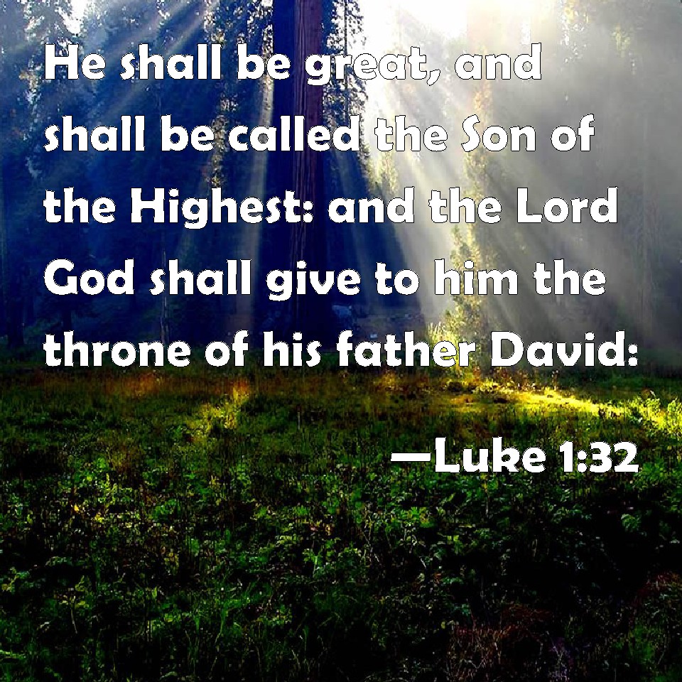 Choose a Background Luke 1:32 He shall be great, and shall be called the Son of the Highest: and the Lord God shall give to him the throne of his father David: KJV: He shall be great, and shall be called the Son of the Highest: and the Lord God shall give unto him the throne of his father David: DRB: He shall be great, and shall be called the Son of the most High; and the Lord God shall give unto him the throne of David his father; and he shall reign in the house of Jacob for ever. DBT: He shall be great, and shall be called Son of the Highest; and the Lord God shall give him the throne of David his father; ERV: He shall be great, and shall be called the Son of the Most High: and the Lord God shall give unto him the throne of his father David: WBT: He will be great, and will be called the Son of the Highest; and the Lord God will give to him the throne of his father David. WEB: He will be great, and will be called the Son of the Most High. The Lord God will give him the throne of his father, David, YLT: he shall be great, and Son of the Highest he shall be called, and the Lord God shall give him the throne of David his father,Links Luke 1:32 NIV • Luke 1:32 NLT • Luke 1:32 ESV • Luke 1:32 NASB • Luke 1:32 KJV • Luke 1:32 Interlinear • Luke 1:32 Commentaries • Luke 1:32 Parallel Texts • Luke 1:32 Bible Apps • Luke 1:32 Parallel • Bible Hub |