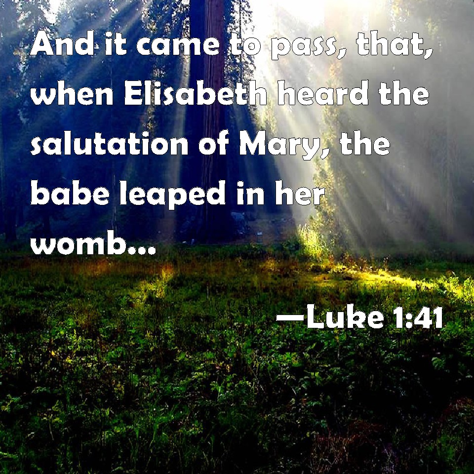 Choose a Background Luke 1:41 And it came to pass, that, when Elisabeth heard the salutation of Mary, the babe leaped in her womb; and Elisabeth was filled with the Holy Ghost: KJV: And it came to pass, that, when Elisabeth heard the salutation of Mary, the babe leaped in her womb; and Elisabeth was filled with the Holy Ghost: DRB: And it came to pass, that when Elizabeth heard the salutation of Mary, the infant leaped in her womb. And Elizabeth was filled with the Holy Ghost: DBT: And it came to pass, as Elizabeth heard the salutation of Mary, the babe leaped in her womb; and Elizabeth was filled with the Holy Spirit, ERV: And it came to pass, when Elisabeth heard the salutation of Mary, the babe leaped in her womb; and Elisabeth was filled with the Holy Ghost; WBT: And it came to pass, that when Elisabeth heard the salutation of Mary, the babe leaped in her womb: and Elisabeth was filled with the Holy Spirit. WEB: It happened, when Elizabeth heard Mary's greeting, that the baby leaped in her womb, and Elizabeth was filled with the Holy Spirit. YLT: And it came to pass, when Elisabeth heard the salutation of Mary, the babe did leap in her womb; and Elisabeth was filled with the Holy Spirit,Links Luke 1:41 NIV • Luke 1:41 NLT • Luke 1:41 ESV • Luke 1:41 NASB • Luke 1:41 KJV • Luke 1:41 Interlinear • Luke 1:41 Commentaries • Luke 1:41 Parallel Texts • Luke 1:41 Bible Apps • Luke 1:41 Parallel • Bible Hub |