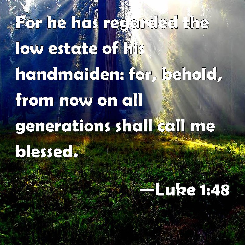 Choose a Background Luke 1:48 For he has regarded the low estate of his handmaiden: for, behold, from now on all generations shall call me blessed. KJV: For he hath regarded the low estate of his handmaiden: for, behold, from henceforth all generations shall call me blessed. DRB: Because he hath regarded the humility of his handmaid; for behold from henceforth all generations shall call me blessed. DBT: For he has looked upon the low estate of his bondmaid; for behold, from henceforth all generations shall call me blessed. ERV: For he hath looked upon the low estate of his handmaiden: For behold, from henceforth all generations shall call me blessed. WBT: For he hath regarded the low estate of his handmaiden: for behold, from henceforth all generations will call me blessed. WEB: for he has looked at the humble state of his handmaid. For behold, from now on, all generations will call me blessed. YLT: Because He looked on the lowliness of His maid-servant, For, lo, henceforth call me happy shall all the generations,Links Luke 1:48 NIV • Luke 1:48 NLT • Luke 1:48 ESV • Luke 1:48 NASB • Luke 1:48 KJV • Luke 1:48 Interlinear • Luke 1:48 Commentaries • Luke 1:48 Parallel Texts • Luke 1:48 Bible Apps • Luke 1:48 Parallel • Bible Hub |