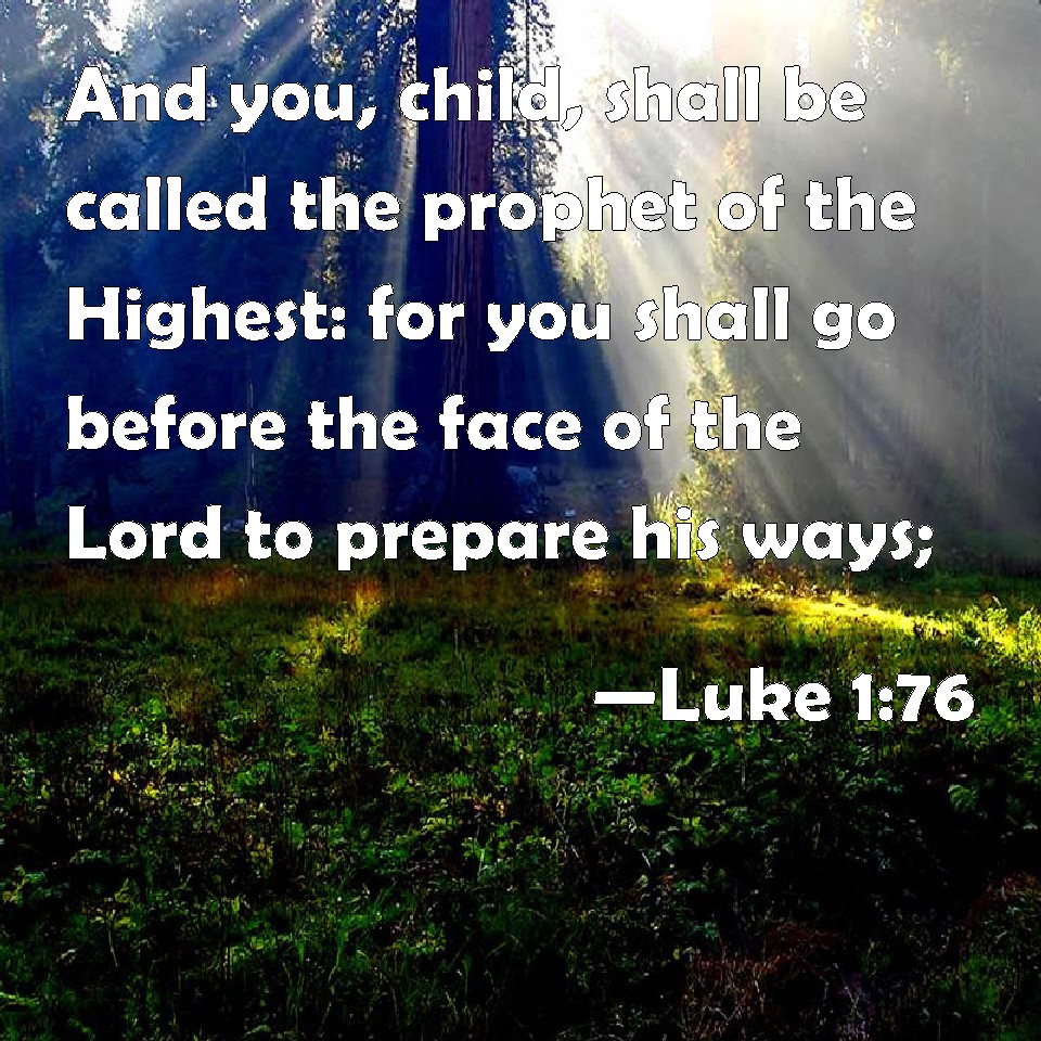 Choose a Background Luke 1:76 And you, child, shall be called the prophet of the Highest: for you shall go before the face of the Lord to prepare his ways; KJV: And thou, child, shalt be called the prophet of the Highest: for thou shalt go before the face of the Lord to prepare his ways; DRB: And thou, child, shalt be called the prophet of the Highest: for thou shalt go before the face of the Lord to prepare his ways: DBT: And thou, child, shalt be called the prophet of the Highest; for thou shalt go before the face of the Lord to make ready his ways; ERV: Yea and thou, child, shalt be called the prophet of the Most High: For thou shalt go before the face of the Lord to make ready his ways; WBT: And thou, child, shalt be called the prophet of the Highest, for thou shalt go before the face of the Lord to prepare his ways; WEB: And you, child, will be called a prophet of the Most High, for you will go before the face of the Lord to prepare his ways, YLT: And thou, child, Prophet of the Highest Shalt thou be called; For thou shalt go before the face of the Lord, To prepare His ways.Links Luke 1:76 NIV • Luke 1:76 NLT • Luke 1:76 ESV • Luke 1:76 NASB • Luke 1:76 KJV • Luke 1:76 Interlinear • Luke 1:76 Commentaries • Luke 1:76 Parallel Texts • Luke 1:76 Bible Apps • Luke 1:76 Parallel • Bible Hub |