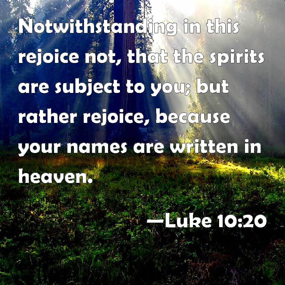 Choose a Background Luke 10:20 Notwithstanding in this rejoice not, that the spirits are subject to you; but rather rejoice, because your names are written in heaven. KJV: Notwithstanding in this rejoice not, that the spirits are subject unto you; but rather rejoice, because your names are written in heaven. DRB: But yet rejoice not in this, that spirits are subject unto you; but rejoice in this, that your names are written in heaven. DBT: Yet in this rejoice not, that the spirits are subjected to you, but rejoice that your names are written in the heavens. ERV: Howbeit in this rejoice not, that the spirits are subject unto you; but rejoice that your names are written in heaven. WBT: Notwithstanding in this rejoice not, that the spirits are subject to you; but rather rejoice, because your names are written in heaven. WEB: Nevertheless, don't rejoice in this, that the spirits are subject to you, but rejoice that your names are written in heaven." YLT: but, in this rejoice not, that the spirits are subjected to you, but rejoice rather that your names were written in the heavens.'Links Luke 10:20 NIV • Luke 10:20 NLT • Luke 10:20 ESV • Luke 10:20 NASB • Luke 10:20 KJV • Luke 10:20 Interlinear • Luke 10:20 Commentaries • Luke 10:20 Parallel Texts • Luke 10:20 Bible Apps • Luke 10:20 Parallel • Bible Hub |