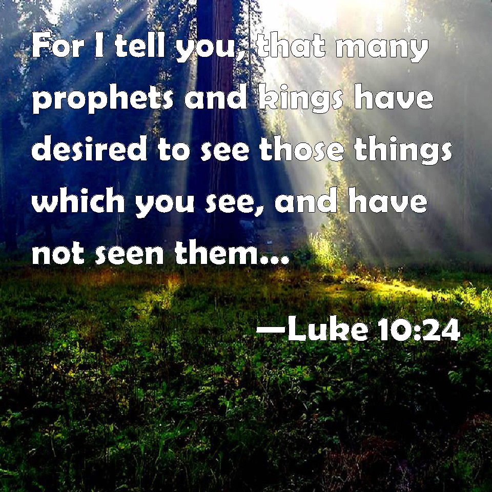 Choose a Background Luke 10:24 For I tell you, that many prophets and kings have desired to see those things which you see, and have not seen them; and to hear those things which you hear, and have not heard them. KJV: For I tell you, that many prophets and kings have desired to see those things which ye see, and have not seen them; and to hear those things which ye hear, and have not heard them. DRB: For I say to you, that many prophets and kings have desired to see the things that you see, and have not seen them; and to hear the things that you hear, and have not heard them. DBT: For I say to you that many prophets and kings have desired to see the things which ye behold, and did not see them; and to hear the things which ye hear, and did not hear them. ERV: for I say unto you, that many prophets and kings desired to see the things which ye see, and saw them not; and to hear the things which ye hear, and heard them not. WBT: For I tell you, that many prophets and kings have desired to see the things which ye see, and have not seen them; and to hear the things which ye hear, and have not heard them. WEB: for I tell you that many prophets and kings desired to see the things which you see, and didn't see them, and to hear the things which you hear, and didn't hear them." YLT: for I say to you, that many prophets and kings did wish to see what ye perceive, and did not see, and to hear what ye hear, and did not hear.'Links Luke 10:24 NIV • Luke 10:24 NLT • Luke 10:24 ESV • Luke 10:24 NASB • Luke 10:24 KJV • Luke 10:24 Interlinear • Luke 10:24 Commentaries • Luke 10:24 Parallel Texts • Luke 10:24 Bible Apps • Luke 10:24 Parallel • Bible Hub |