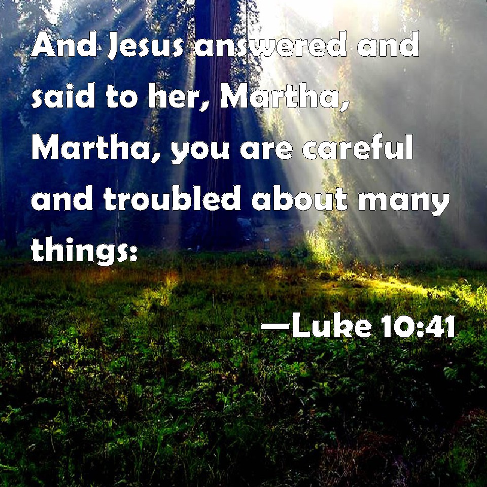 Choose a Background Luke 10:41 And Jesus answered and said to her, Martha, Martha, you are careful and troubled about many things: KJV: And Jesus answered and said unto her, Martha, Martha, thou art careful and troubled about many things: DRB: And the Lord answering, said to her: Martha, Martha, thou art careful, and art troubled about many things: DBT: But Jesus answering said to her, Martha, Martha, thou art careful and troubled about many things; ERV: But the Lord answered and said unto her, Martha, Martha, thou art anxious and troubled about many things: WBT: And Jesus answered, and said to her, Martha, Martha, thou art anxious, and troubled about many things: WEB: Jesus answered her, "Martha, Martha, you are anxious and troubled about many things, YLT: And Jesus answering said to her, 'Martha, Martha, thou art anxious and disquieted about many things,Links Luke 10:41 NIV • Luke 10:41 NLT • Luke 10:41 ESV • Luke 10:41 NASB • Luke 10:41 KJV • Luke 10:41 Interlinear • Luke 10:41 Commentaries • Luke 10:41 Parallel Texts • Luke 10:41 Bible Apps • Luke 10:41 Parallel • Bible Hub |