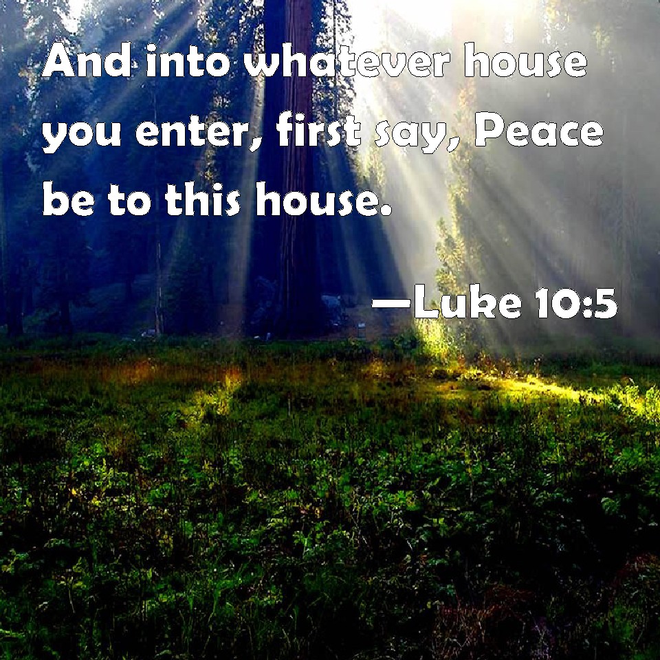 Choose a Background Luke 10:5 And into whatever house you enter, first say, Peace be to this house. KJV: And into whatsoever house ye enter, first say, Peace be to this house. DRB: Into whatsoever house you enter, first say: Peace be to this house. DBT: And into whatsoever house ye enter, first say, Peace to this house. ERV: And into whatsoever house ye shall enter, first say, Peace be to this house. WBT: And into whatever house ye enter, first say, Peace be to this house. WEB: Into whatever house you enter, first say, 'Peace be to this house.' YLT: and into whatever house ye do enter, first say, Peace to this house;Links Luke 10:5 NIV • Luke 10:5 NLT • Luke 10:5 ESV • Luke 10:5 NASB • Luke 10:5 KJV • Luke 10:5 Interlinear • Luke 10:5 Commentaries • Luke 10:5 Parallel Texts • Luke 10:5 Bible Apps • Luke 10:5 Parallel • Bible Hub |