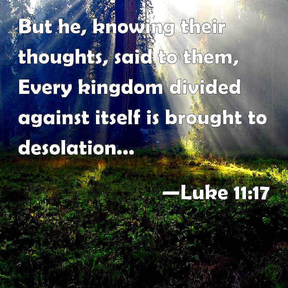 Choose a Background Luke 11:17 But he, knowing their thoughts, said to them, Every kingdom divided against itself is brought to desolation; and a house divided against a house falls. KJV: But he, knowing their thoughts, said unto them, Every kingdom divided against itself is brought to desolation; and a house divided against a house falleth. DRB: But he seeing their thoughts, said to them: Every kingdom divided against itself, shall be brought to desolation, and house upon house shall fall. DBT: But he, knowing their thoughts, said to them, Every kingdom divided against itself is brought to desolation: and a house set against a house falls; ERV: But he, knowing their thoughts, said unto them, Every kingdom divided against itself is brought to desolation; and a house divided against a house falleth. WBT: But he, knowing their thoughts, said to them, Every kingdom divided against itself is brought to desolation; and a house divided against a house falleth. WEB: But he, knowing their thoughts, said to them, "Every kingdom divided against itself is brought to desolation. A house divided against itself falls. YLT: And he, knowing their thoughts, said to them, 'Every kingdom having been divided against itself is desolated; and house against house doth fall;Links Luke 11:17 NIV • Luke 11:17 NLT • Luke 11:17 ESV • Luke 11:17 NASB • Luke 11:17 KJV • Luke 11:17 Interlinear • Luke 11:17 Commentaries • Luke 11:17 Parallel Texts • Luke 11:17 Bible Apps • Luke 11:17 Parallel • Bible Hub |
