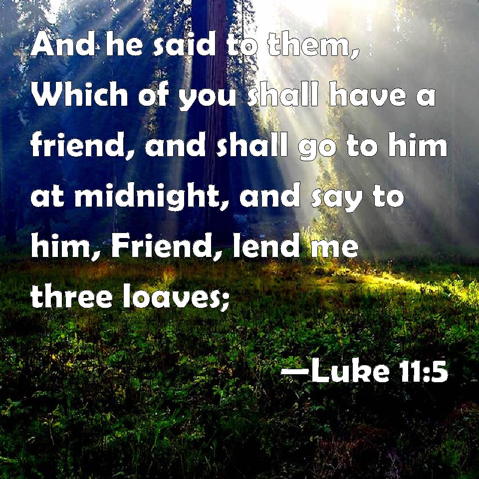 Choose a Background Luke 11:5 And he said to them, Which of you shall have a friend, and shall go to him at midnight, and say to him, Friend, lend me three loaves; KJV: And he said unto them, Which of you shall have a friend, and shall go unto him at midnight, and say unto him, Friend, lend me three loaves; DRB: And he said to them: Which of you shall have a friend, and shall go to him at midnight, and shall say to him: Friend, lend me three loaves, DBT: And he said to them, Who among you shall have a friend, and shall go to him at midnight and say to him, Friend, let me have three loaves, ERV: And he said unto them, Which of you shall have a friend, and shall go unto him at midnight, and say to him, Friend, lend me three loaves; WBT: And he said to them, Which of you shall have a friend, and shall go to him at midnight, and say to him, Friend, lend me three loaves: WEB: He said to them, "Which of you, if you go to a friend at midnight, and tell him, 'Friend, lend me three loaves of bread, YLT: And he said unto them, 'Who of you shall have a friend, and shall go on unto him at midnight, and may say to him, Friend, lend me three loaves,Links Luke 11:5 NIV • Luke 11:5 NLT • Luke 11:5 ESV • Luke 11:5 NASB • Luke 11:5 KJV • Luke 11:5 Interlinear • Luke 11:5 Commentaries • Luke 11:5 Parallel Texts • Luke 11:5 Bible Apps • Luke 11:5 Parallel • Bible Hub |