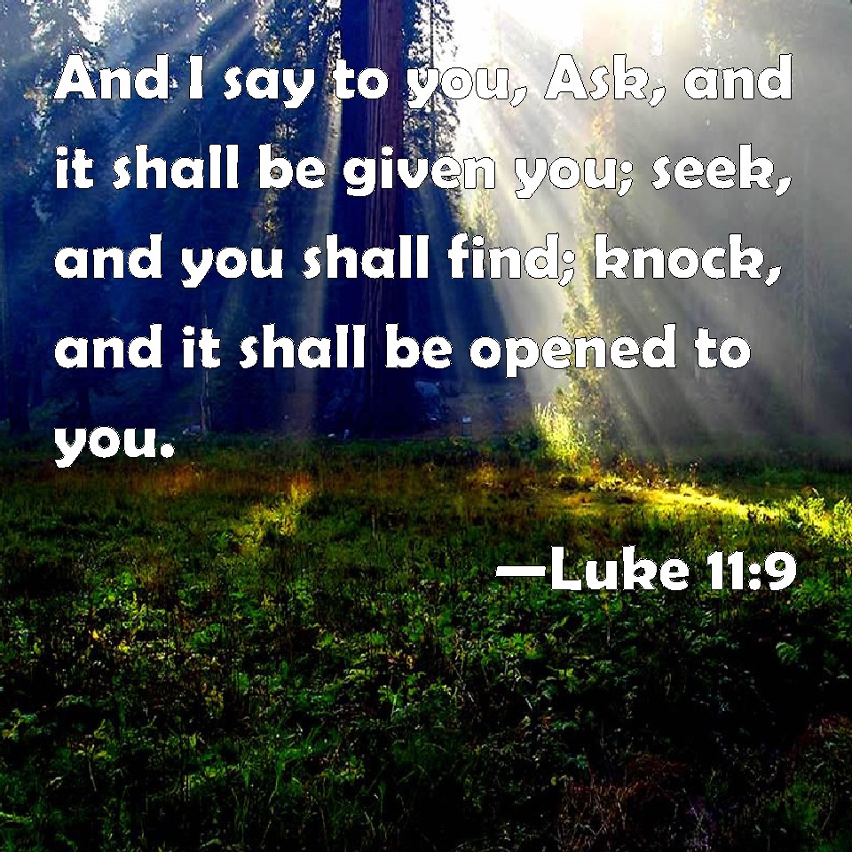 Choose a Background Luke 11:9 And I say to you, Ask, and it shall be given you; seek, and you shall find; knock, and it shall be opened to you. KJV: And I say unto you, Ask, and it shall be given you; seek, and ye shall find; knock, and it shall be opened unto you. DRB: And I say to you, Ask, and it shall be given you: seek, and you shall find: knock, and it shall be opened to you. DBT: And I say to you, Ask, and it shall be given to you; seek, and ye shall find; knock, and it shall be opened to you. ERV: And I say unto you, Ask, and it shall be given you; seek, and ye shall find; knock, and it shall be opened unto you. WBT: And I say to you, Ask, and it shall be given you; seek, and ye shall find; knock, and the door shall be opened to you. WEB: "I tell you, keep asking, and it will be given you. Keep seeking, and you will find. Keep knocking, and it will be opened to you. YLT: and I say to you, Ask, and it shall be given to you; seek, and ye shall find; knock, and it shall be opened to you;Links Luke 11:9 NIV • Luke 11:9 NLT • Luke 11:9 ESV • Luke 11:9 NASB • Luke 11:9 KJV • Luke 11:9 Interlinear • Luke 11:9 Commentaries • Luke 11:9 Parallel Texts • Luke 11:9 Bible Apps • Luke 11:9 Parallel • Bible Hub |