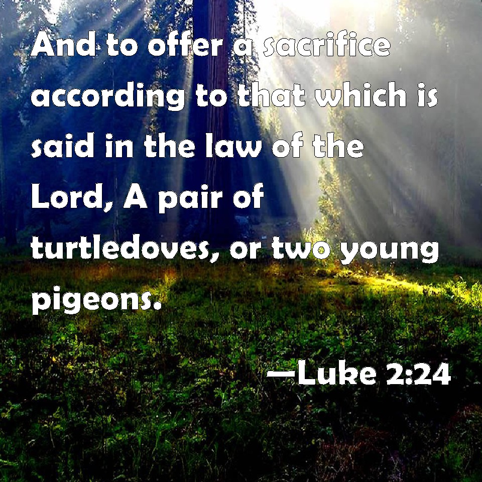 Choose a Background Luke 2:24 And to offer a sacrifice according to that which is said in the law of the Lord, A pair of turtledoves, or two young pigeons. KJV: And to offer a sacrifice according to that which is said in the law of the Lord, A pair of turtledoves, or two young pigeons. DRB: And to offer a sacrifice, according as it is written in the law of the Lord, a pair of turtledoves, or two young pigeons: DBT: and to offer a sacrifice according to what is said in the law of the Lord: A pair of turtle doves, or two young pigeons. ERV: and to offer a sacrifice according to that which is said in the law of the Lord, A pair of turtledoves, or two young pigeons. WBT: And to offer a sacrifice according to that which is said in the law of the Lord, A pair of turtle-doves, or two young pigeons. WEB: and to offer a sacrifice according to that which is said in the law of the Lord, "A pair of turtledoves, or two young pigeons." YLT: and to give a sacrifice, according to that said in the Law of the Lord, 'A pair of turtle-doves, or two young pigeons.'Links Luke 2:24 NIV • Luke 2:24 NLT • Luke 2:24 ESV • Luke 2:24 NASB • Luke 2:24 KJV • Luke 2:24 Interlinear • Luke 2:24 Commentaries • Luke 2:24 Parallel Texts • Luke 2:24 Bible Apps • Luke 2:24 Parallel • Bible Hub |