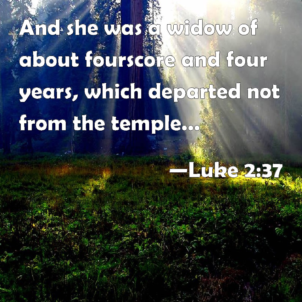 Choose a Background Luke 2:37 And she was a widow of about fourscore and four years, which departed not from the temple, but served God with fastings and prayers night and day. KJV: And she was a widow of about fourscore and four years, which departed not from the temple, but served God with fastings and prayers night and day. DRB: And she was a widow until fourscore and four years; who departed not from the temple, by fastings and prayers serving night and day. DBT: and herself a widow up to eighty-four years; who did not depart from the temple, serving night and day with fastings and prayers; ERV: and she had been a widow even for fourscore and four years), which departed not from the temple, worshipping with fastings and supplications night and day. WBT: And she was a widow of about eighty four years, who departed not from the temple, but served God with fastings and prayers night and day. WEB: and she had been a widow for about eighty-four years), who didn't depart from the temple, worshipping with fastings and petitions night and day. YLT: and she is a widow of about eighty-four years, who did depart not from the temple, with fasts and supplications serving, night and day,Links Luke 2:37 NIV • Luke 2:37 NLT • Luke 2:37 ESV • Luke 2:37 NASB • Luke 2:37 KJV • Luke 2:37 Interlinear • Luke 2:37 Commentaries • Luke 2:37 Parallel Texts • Luke 2:37 Bible Apps • Luke 2:37 Parallel • Bible Hub |
