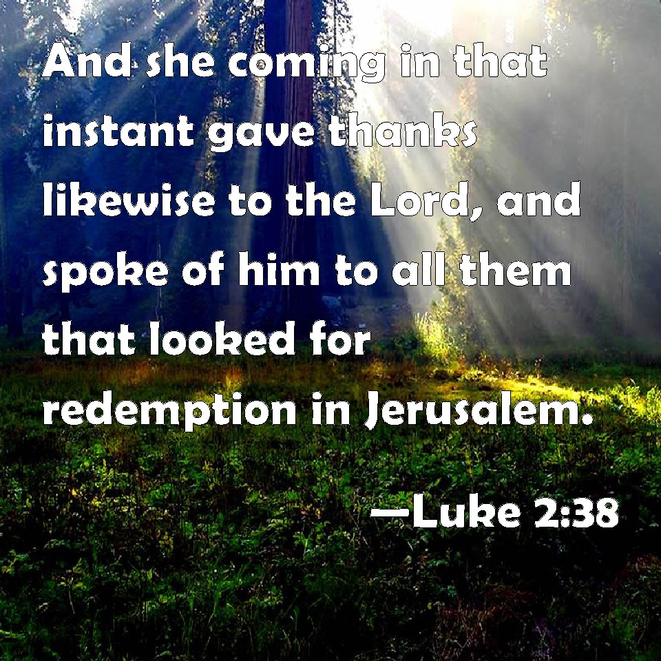 Choose a Background Luke 2:38 And she coming in that instant gave thanks likewise to the Lord, and spoke of him to all them that looked for redemption in Jerusalem. KJV: And she coming in that instant gave thanks likewise unto the Lord, and spake of him to all them that looked for redemption in Jerusalem. DRB: Now she, at the same hour, coming in, confessed to the Lord; and spoke of him to all that looked for the redemption of Israel. DBT: and she coming up the same hour gave praise to the Lord, and spoke of him to all those who waited for redemption in Jerusalem. ERV: And coming up at that very hour she gave thanks unto God, and spake of him to all them that were looking for the redemption of Jerusalem. WBT: And she coming in that instant, gave thanks likewise to the Lord, and spoke of him to all them that looked for redemption in Jerusalem. WEB: Coming up at that very hour, she gave thanks to the Lord, and spoke of him to all those who were looking for redemption in Jerusalem. YLT: and she, at that hour, having come in, was confessing, likewise, to the Lord, and was speaking concerning him, to all those looking for redemption in Jerusalem.Links Luke 2:38 NIV • Luke 2:38 NLT • Luke 2:38 ESV • Luke 2:38 NASB • Luke 2:38 KJV • Luke 2:38 Interlinear • Luke 2:38 Commentaries • Luke 2:38 Parallel Texts • Luke 2:38 Bible Apps • Luke 2:38 Parallel • Bible Hub |