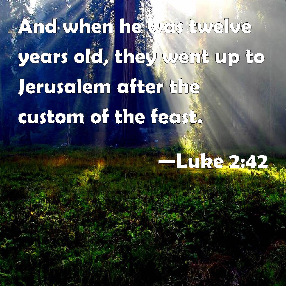 Choose a Background Luke 2:42 And when he was twelve years old, they went up to Jerusalem after the custom of the feast. KJV: And when he was twelve years old, they went up to Jerusalem after the custom of the feast. DRB: And when he was twelve years old, they going up into Jerusalem, according to the custom of the feast, DBT: And when he was twelve years old, and they went up to Jerusalem according to the custom of the feast ERV: And when he was twelve years old, they went up after the custom of the feast; WBT: And when he was twelve years old, they went up to Jerusalem according to the custom of the feast. WEB: When he was twelve years old, they went up to Jerusalem according to the custom of the feast, YLT: and when he became twelve years old, they having gone up to Jerusalem, according to the custom of the feast,Links Luke 2:42 NIV • Luke 2:42 NLT • Luke 2:42 ESV • Luke 2:42 NASB • Luke 2:42 KJV • Luke 2:42 Interlinear • Luke 2:42 Commentaries • Luke 2:42 Parallel Texts • Luke 2:42 Bible Apps • Luke 2:42 Parallel • Bible Hub |
