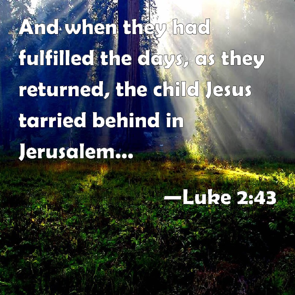 Choose a Background Luke 2:43 And when they had fulfilled the days, as they returned, the child Jesus tarried behind in Jerusalem; and Joseph and his mother knew not of it. KJV: And when they had fulfilled the days, as they returned, the child Jesus tarried behind in Jerusalem; and Joseph and his mother knew not of it. DRB: And having fulfilled the days, when they returned, the child Jesus remained in Jerusalem; and his parents knew it not. DBT: and had completed the days, as they returned, the boy Jesus remained behind in Jerusalem, and his parents knew not of it; ERV: and when they had fulfilled the days, as they were returning, the boy Jesus tarried behind in Jerusalem; and his parents knew it not; WBT: And when they had fulfilled the days, as they returned, the child Jesus tarried behind in Jerusalem; and Joseph and his mother knew not of it. WEB: and when they had fulfilled the days, as they were returning, the boy Jesus stayed behind in Jerusalem. Joseph and his mother didn't know it, YLT: and having finished the days, in their returning the child Jesus remained behind in Jerusalem, and Joseph and his mother did not know,Links Luke 2:43 NIV • Luke 2:43 NLT • Luke 2:43 ESV • Luke 2:43 NASB • Luke 2:43 KJV • Luke 2:43 Interlinear • Luke 2:43 Commentaries • Luke 2:43 Parallel Texts • Luke 2:43 Bible Apps • Luke 2:43 Parallel • Bible Hub |