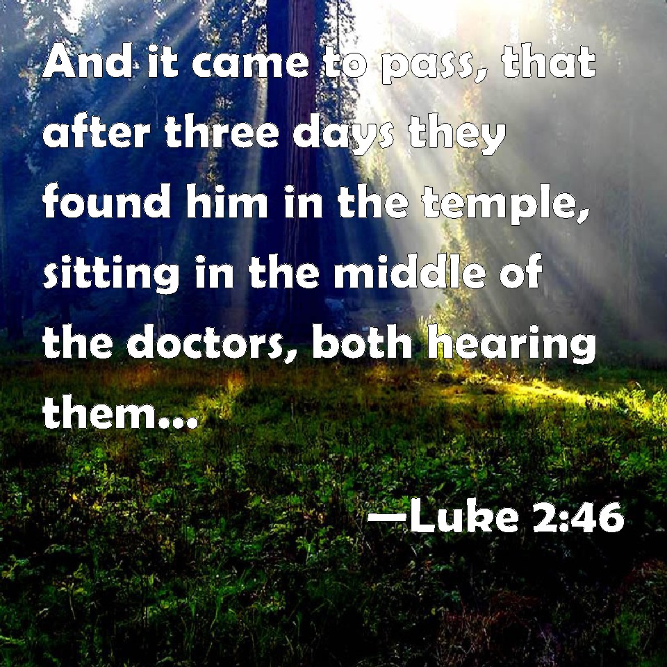 Choose a Background Luke 2:46 And it came to pass, that after three days they found him in the temple, sitting in the middle of the doctors, both hearing them, and asking them questions. KJV: And it came to pass, that after three days they found him in the temple, sitting in the midst of the doctors, both hearing them, and asking them questions. DRB: And it came to pass, that, after three days, they found him in the temple, sitting in the midst of the doctors, hearing them, and asking them questions. DBT: And it came to pass, after three days they found him in the temple, sitting in the midst of the teachers and hearing them and asking them questions. ERV: And it came to pass, after three days they found him in the temple, sitting in the midst of the doctors, both hearing them, and asking them questions: WBT: And it came to pass, that after three days they found him in the temple, sitting in the midst of the doctors, both hearing them, and asking them questions. WEB: It happened after three days they found him in the temple, sitting in the midst of the teachers, both listening to them, and asking them questions. YLT: And it came to pass, after three days, they found him in the temple, sitting in the midst of the teachers, both hearing them and questioning them,Links Luke 2:46 NIV • Luke 2:46 NLT • Luke 2:46 ESV • Luke 2:46 NASB • Luke 2:46 KJV • Luke 2:46 Interlinear • Luke 2:46 Commentaries • Luke 2:46 Parallel Texts • Luke 2:46 Bible Apps • Luke 2:46 Parallel • Bible Hub |