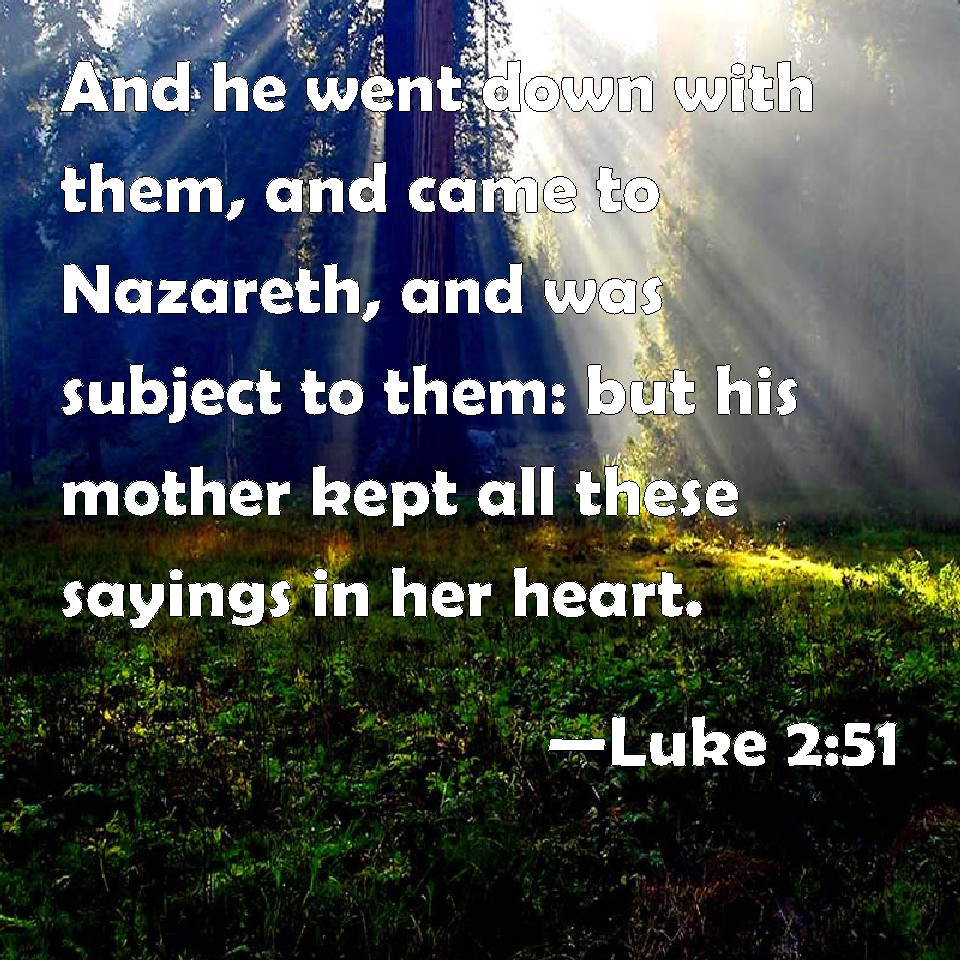Choose a Background Luke 2:51 And he went down with them, and came to Nazareth, and was subject to them: but his mother kept all these sayings in her heart. KJV: And he went down with them, and came to Nazareth, and was subject unto them: but his mother kept all these sayings in her heart. DRB: And he went down with them, and came to Nazareth, and was subject to them. And his mother kept all these words in her heart. DBT: And he went down with them and came to Nazareth, and he was in subjection to them. And his mother kept all these things in her heart. ERV: And he went down with them, and came to Nazareth; and he was subject unto them: and his mother kept all these sayings in her heart. WBT: And he went down with them, and came to Nazareth, and was subject to them: but his mother kept all these sayings in her heart. WEB: And he went down with them, and came to Nazareth. He was subject to them, and his mother kept all these sayings in her heart. YLT: and he went down with them, and came to Nazareth, and he was subject to them, and his mother was keeping all these sayings in her heart,Links Luke 2:51 NIV • Luke 2:51 NLT • Luke 2:51 ESV • Luke 2:51 NASB • Luke 2:51 KJV • Luke 2:51 Interlinear • Luke 2:51 Commentaries • Luke 2:51 Parallel Texts • Luke 2:51 Bible Apps • Luke 2:51 Parallel • Bible Hub |