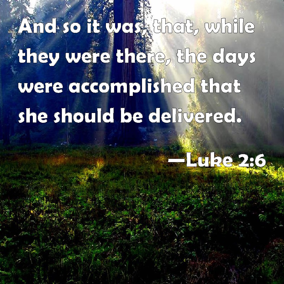 Choose a Background Luke 2:6 And so it was, that, while they were there, the days were accomplished that she should be delivered. KJV: And so it was, that, while they were there, the days were accomplished that she should be delivered. DRB: And it came to pass, that when they were there, her days were accomplished, that she should be delivered. DBT: And it came to pass, while they were there, the days of her giving birth to her child were fulfilled, ERV: And it came to pass, while they were there, the days were fulfilled that she should be delivered. WBT: And so it was, that while they were there, the days were accomplished that she should be delivered. WEB: It happened, while they were there, that the day had come that she should give birth. YLT: And it came to pass, in their being there, the days were fulfilled for her bringing forth,Links Luke 2:6 NIV • Luke 2:6 NLT • Luke 2:6 ESV • Luke 2:6 NASB • Luke 2:6 KJV • Luke 2:6 Interlinear • Luke 2:6 Commentaries • Luke 2:6 Parallel Texts • Luke 2:6 Bible Apps • Luke 2:6 Parallel • Bible Hub |