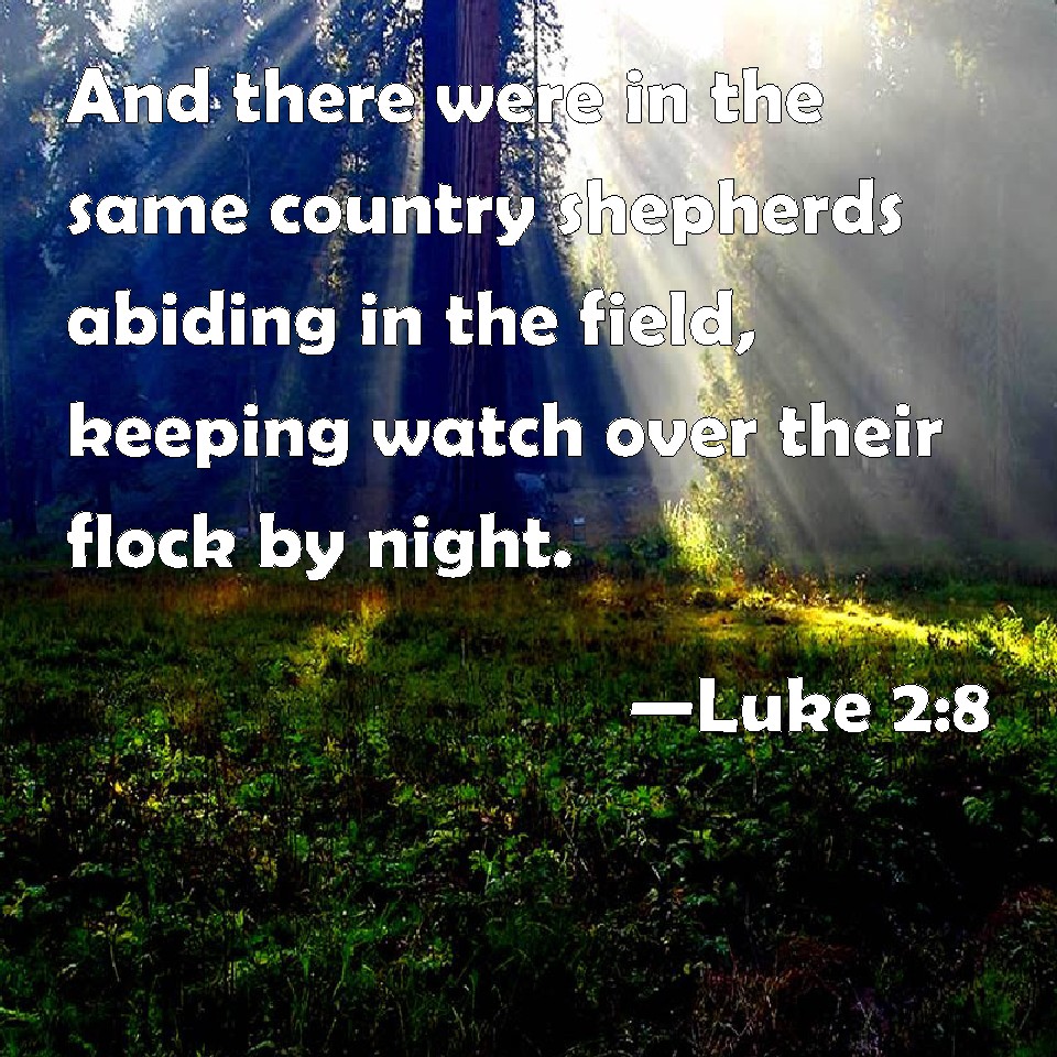 Choose a Background Luke 2:8 And there were in the same country shepherds abiding in the field, keeping watch over their flock by night. KJV: And there were in the same country shepherds abiding in the field, keeping watch over their flock by night. DRB: And there were in the same country shepherds watching, and keeping the night watches over their flock. DBT: And there were shepherds in that country abiding without, and keeping watch by night over their flock. ERV: And there were shepherds in the same country abiding in the field, and keeping watch by night over their flock. WBT: And there were in the same country shepherds abiding in the field, keeping watch over their flock by night. WEB: There were shepherds in the same country staying in the field, and keeping watch by night over their flock. YLT: And there were shepherds in the same region, lodging in the field, and keeping the night-watches over their flock,Links Luke 2:8 NIV • Luke 2:8 NLT • Luke 2:8 ESV • Luke 2:8 NASB • Luke 2:8 KJV • Luke 2:8 Interlinear • Luke 2:8 Commentaries • Luke 2:8 Parallel Texts • Luke 2:8 Bible Apps • Luke 2:8 Parallel • Bible Hub |