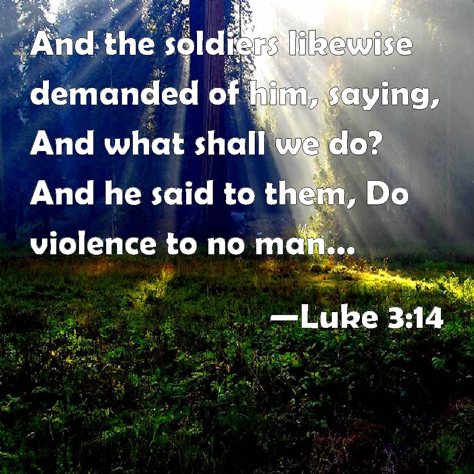 Luke 3:14 And the soldiers likewise demanded of him, saying, And what shall we do? And he said to them, Do violence to no man, neither accuse any falsely; and be content with your wages.