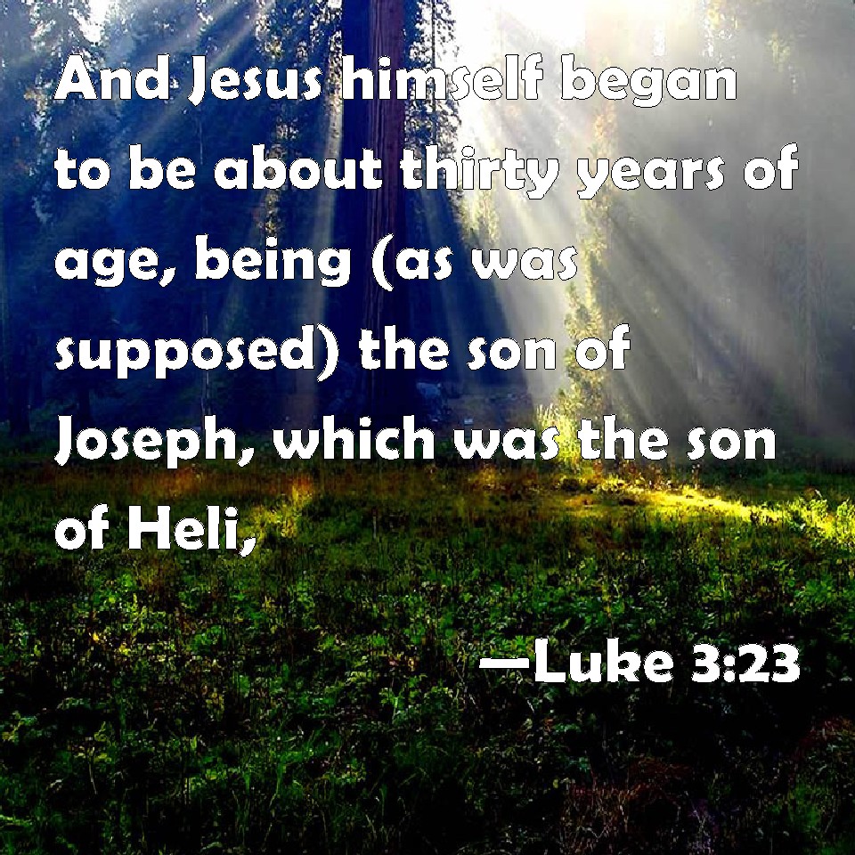 Choose a Background Luke 3:23 And Jesus himself began to be about thirty years of age, being (as was supposed) the son of Joseph, which was the son of Heli, KJV: And Jesus himself began to be about thirty years of age, being (as was supposed) the son of Joseph, which was the son of Heli, DRB: And Jesus himself was beginning about the age of thirty years; being (as it was supposed) the son of Joseph, who was of Heli, who was of Mathat, DBT: And Jesus himself was beginning to be about thirty years old; being as was supposed son of Joseph; of Eli, ERV: And Jesus himself, when he began to teach, was about thirty years of age, being the son (as was supposed) of Joseph, the son of Heli, WBT: And Jesus himself began to be about thirty years of age, being (as was supposed) the son of Joseph, who was the son of Heli, WEB: Jesus himself, when he began to teach, was about thirty years old, being the son (as was supposed) of Joseph, the son of Heli, YLT: And Jesus himself was beginning to be about thirty years of age, being, as was supposed, son of Joseph,Links Luke 3:23 NIV • Luke 3:23 NLT • Luke 3:23 ESV • Luke 3:23 NASB • Luke 3:23 KJV • Luke 3:23 Interlinear • Luke 3:23 Commentaries • Luke 3:23 Parallel Texts • Luke 3:23 Bible Apps • Luke 3:23 Parallel • Bible Hub |