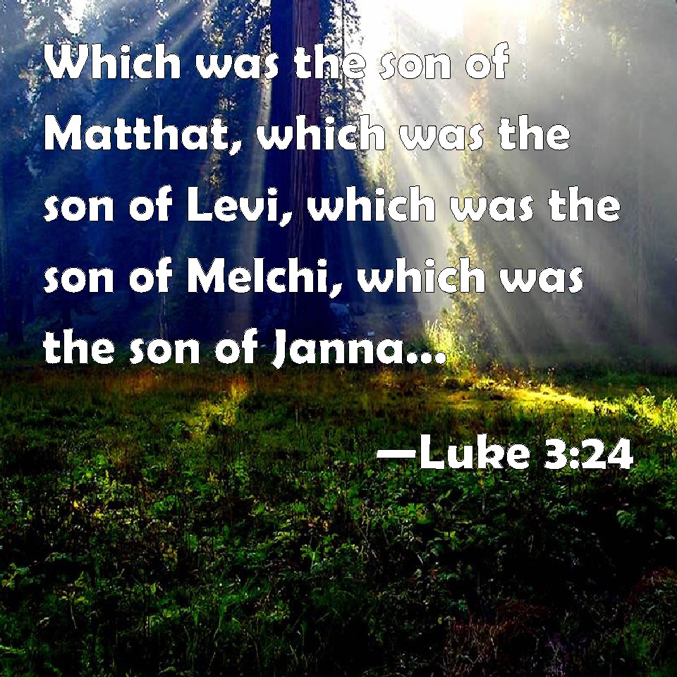 Choose a Background Luke 3:24 Which was the son of Matthat, which was the son of Levi, which was the son of Melchi, which was the son of Janna, which was the son of Joseph, KJV: Which was the son of Matthat, which was the son of Levi, which was the son of Melchi, which was the son of Janna, which was the son of Joseph, DRB: Who was of Levi, who was of Melchi, who was of Janne, who was of Joseph, DBT: of Matthat, of Levi, of Melchi, of Janna, of Joseph, ERV: the son of Matthat, the son of Levi, the son of Melchi, the son of Jannai, the son of Joseph, WBT: Who was the son of Matthat, who was the son of Levi, who was the son of Melchi, who was the son of Janna, who was the son of Joseph, WEB: the son of Matthat, the son of Levi, the son of Melchi, the son of Jannai, the son of Joseph, YLT: the son of Eli, the son of Matthat, the son of Levi, the son of Melchi, the son of Janna, the son of Joseph,Links Luke 3:24 NIV • Luke 3:24 NLT • Luke 3:24 ESV • Luke 3:24 NASB • Luke 3:24 KJV • Luke 3:24 Interlinear • Luke 3:24 Commentaries • Luke 3:24 Parallel Texts • Luke 3:24 Bible Apps • Luke 3:24 Parallel • Bible Hub |