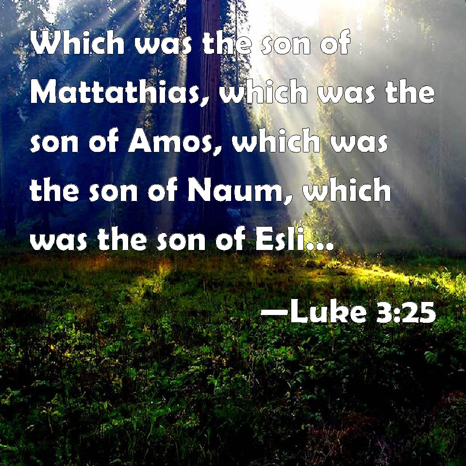 Choose a Background Luke 3:25 Which was the son of Mattathias, which was the son of Amos, which was the son of Naum, which was the son of Esli, which was the son of Nagge, KJV: Which was the son of Mattathias, which was the son of Amos, which was the son of Naum, which was the son of Esli, which was the son of Nagge, DRB: Who was of Mathathias, who was of Amos, who was of Nahum, who was of Hesli, who was of Nagge, DBT: of Mattathias, of Amos, of Naoum, of Esli, of Naggai, ERV: the son of Mattathias, the son of Amos, the son of Nahum, the son of Esli, the son of Naggai, WBT: Who was the son of Mattathias, who was the son of Amos, who was the son of Naum, who was the son of Esli, who was the son of Nagge, WEB: the son of Mattathias, the son of Amos, the son of Nahum, the son of Esli, the son of Naggai, YLT: the son of Mattathias, the son of Amos, the son of Naum, the son of Esli,Links Luke 3:25 NIV • Luke 3:25 NLT • Luke 3:25 ESV • Luke 3:25 NASB • Luke 3:25 KJV • Luke 3:25 Interlinear • Luke 3:25 Commentaries • Luke 3:25 Parallel Texts • Luke 3:25 Bible Apps • Luke 3:25 Parallel • Bible Hub |