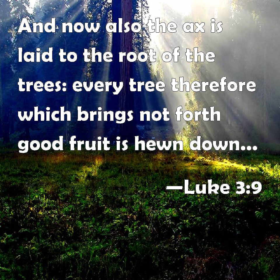 Choose a Background Luke 3:9 And now also the ax is laid to the root of the trees: every tree therefore which brings not forth good fruit is hewn down, and cast into the fire. KJV: And now also the axe is laid unto the root of the trees: every tree therefore which bringeth not forth good fruit is hewn down, and cast into the fire. DRB: For now the axe is laid to the root of the trees. Every tree therefore that bringeth not forth good fruit, shall be cut down and cast into the fire. DBT: And already also the axe is applied to the root of the trees; every tree therefore not producing good fruit is cut down and cast into the fire. ERV: And even now is the axe also laid unto the root of the trees: every tree therefore that bringeth not forth good fruit is hewn down, and cast into the fire. WBT: And now also the ax is laid to the root of the trees: every tree therefore which bringeth not forth good fruit, is hewn down, and cast into the fire. WEB: Even now the axe also lies at the root of the trees. Every tree therefore that doesn't bring forth good fruit is cut down, and thrown into the fire." YLT: and already also the axe unto the root of the trees is laid, every tree, therefore, not making good fruit is cut down, and to fire it is cast.'Links Luke 3:9 NIV • Luke 3:9 NLT • Luke 3:9 ESV • Luke 3:9 NASB • Luke 3:9 KJV • Luke 3:9 Interlinear • Luke 3:9 Commentaries • Luke 3:9 Parallel Texts • Luke 3:9 Bible Apps • Luke 3:9 Parallel • Bible Hub |
