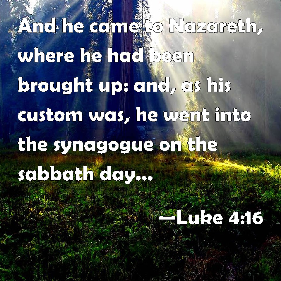 Choose a Background Luke 4:16 And he came to Nazareth, where he had been brought up: and, as his custom was, he went into the synagogue on the sabbath day, and stood up for to read. KJV: And he came to Nazareth, where he had been brought up: and, as his custom was, he went into the synagogue on the sabbath day, and stood up for to read. DRB: And he came to Nazareth, where he was brought up: and he went into the synagogue, according to his custom, on the sabbath day; and he rose up to read. DBT: And he came to Nazareth, where he was brought up; and he entered, according to his custom, into the synagogue on the sabbath day, and stood up to read. ERV: And he came to Nazareth, where he had been brought up: and he entered, as his custom was, into the synagogue on the sabbath day, and stood up to read. WBT: And he came to Nazareth, where he had been brought up: and, as his custom was, he went into the synagogue on the sabbath, and stood up to read. WEB: He came to Nazareth, where he had been brought up. He entered, as was his custom, into the synagogue on the Sabbath day, and stood up to read. YLT: And he came to Nazareth, where he hath been brought up, and he went in, according to his custom, on the sabbath-day, to the synagogue, and stood up to read;Links Luke 4:16 NIV • Luke 4:16 NLT • Luke 4:16 ESV • Luke 4:16 NASB • Luke 4:16 KJV • Luke 4:16 Interlinear • Luke 4:16 Commentaries • Luke 4:16 Parallel Texts • Luke 4:16 Bible Apps • Luke 4:16 Parallel • Bible Hub |