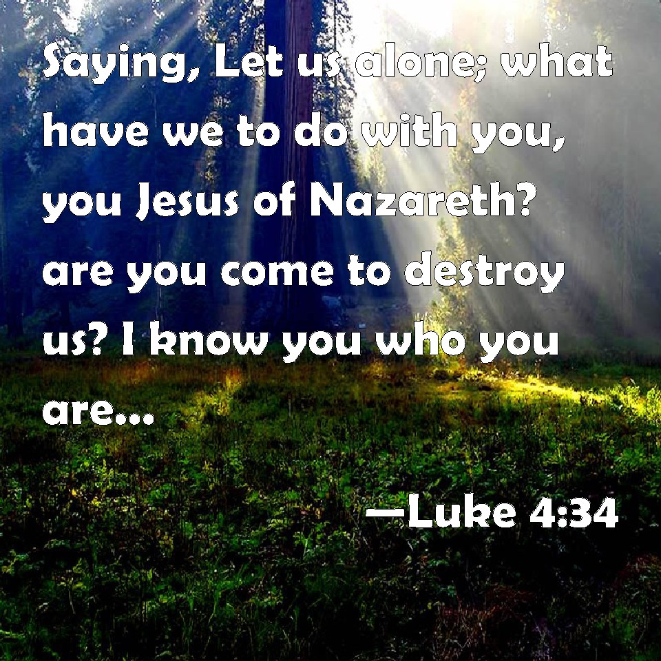 Choose a Background Luke 4:34 Saying, Let us alone; what have we to do with you, you Jesus of Nazareth? are you come to destroy us? I know you who you are; the Holy One of God. KJV: Saying, Let us alone; what have we to do with thee, thou Jesus of Nazareth? art thou come to destroy us? I know thee who thou art; the Holy One of God. DRB: Saying: Let us alone, what have we to do with thee, Jesus of Nazareth? art thou come to destroy us? I know thee who thou art, the holy one of God. DBT: saying, Eh! what have we to do with thee, Jesus, Nazarene? hast thou come to destroy us? I know thee who thou art, the Holy One of God. ERV: Ah! what have we to do with thee, thou Jesus of Nazareth? art thou come to destroy us? I know thee who thou art, the Holy One of God. WBT: Saying, Let us alone; what have we to do with thee, Jesus of Nazareth? art thou come to destroy us? I know thee who thou art, the Holy One of God. WEB: saying, "Ah! what have we to do with you, Jesus of Nazareth? Have you come to destroy us? I know you who you are: the Holy One of God!" YLT: saying, 'Away, what — to us and to thee, Jesus, O Nazarene? thou didst come to destroy us; I have known thee who thou art — the Holy One of God.'Links Luke 4:34 NIV • Luke 4:34 NLT • Luke 4:34 ESV • Luke 4:34 NASB • Luke 4:34 KJV • Luke 4:34 Interlinear • Luke 4:34 Commentaries • Luke 4:34 Parallel Texts • Luke 4:34 Bible Apps • Luke 4:34 Parallel • Bible Hub |