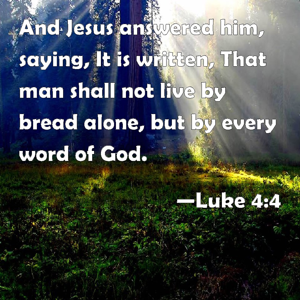 Choose a Background Luke 4:4 And Jesus answered him, saying, It is written, That man shall not live by bread alone, but by every word of God. KJV: And Jesus answered him, saying, It is written, That man shall not live by bread alone, but by every word of God. DRB: And Jesus answered him: It is written, that Man liveth not by bread alone, but by every word of God. DBT: And Jesus answered unto him saying, It is written, Man shall not live by bread alone, but by every word of God. ERV: And Jesus answered unto him, It is written, Man shall not live by bread alone. WBT: And Jesus answered him, saying, It is written, That man shall not live by bread alone, but by every word of God. WEB: Jesus answered him, saying, "It is written, 'Man shall not live by bread alone, but by every word of God.'" YLT: And Jesus answered him, saying, 'It hath been written, that, not on bread only shall man live, but on every saying of God.'Links Luke 4:4 NIV • Luke 4:4 NLT • Luke 4:4 ESV • Luke 4:4 NASB • Luke 4:4 KJV • Luke 4:4 Interlinear • Luke 4:4 Commentaries • Luke 4:4 Parallel Texts • Luke 4:4 Bible Apps • Luke 4:4 Parallel • Bible Hub |