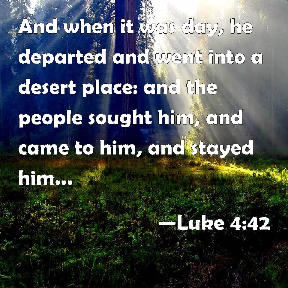 Choose a Background Luke 4:42 And when it was day, he departed and went into a desert place: and the people sought him, and came to him, and stayed him, that he should not depart from them. KJV: And when it was day, he departed and went into a desert place: and the people sought him, and came unto him, and stayed him, that he should not depart from them. DRB: And when it was day, going out he went into a desert place, and the multitudes sought him, and came unto him: and they stayed him that he should not depart from them. DBT: And when it was day he went out, and went into a desert place, and the crowds sought after him, and came up to him, and would have kept him back that he should not go from them. ERV: And when it was day, he came out and went into a desert place: and the multitudes sought after him, and came unto him, and would have stayed him, that he should not go from them. WBT: And when it was day, he departed, and went into a desert place; and the people sought him, and came to him, and stayed him, that he should not depart from them. WEB: When it was day, he departed and went into an uninhabited place, and the multitudes looked for him, and came to him, and held on to him, so that he wouldn't go away from them. YLT: And day having come, having gone forth, he went on to a desert place, and the multitudes were seeking him, and they came unto him, and were staying him — not to go on from them,Links Luke 4:42 NIV • Luke 4:42 NLT • Luke 4:42 ESV • Luke 4:42 NASB • Luke 4:42 KJV • Luke 4:42 Interlinear • Luke 4:42 Commentaries • Luke 4:42 Parallel Texts • Luke 4:42 Bible Apps • Luke 4:42 Parallel • Bible Hub |