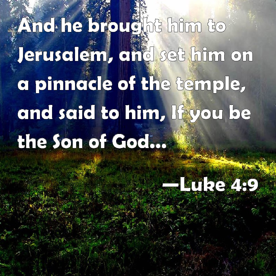 Choose a Background Luke 4:9 And he brought him to Jerusalem, and set him on a pinnacle of the temple, and said to him, If you be the Son of God, cast yourself down from hence: KJV: And he brought him to Jerusalem, and set him on a pinnacle of the temple, and said unto him, If thou be the Son of God, cast thyself down from hence: DRB: And he brought him to Jerusalem, and set him on a pinnacle of the temple, and he said to him: If thou be the Son of God, cast thyself from hence. DBT: And he led him to Jerusalem, and set him on the edge of the temple, and said to him, If thou be Son of God, cast thyself down hence; ERV: And he led him to Jerusalem, and set him on the pinnacle of the temple, and said unto him, If thou art the Son of God, cast thyself down from hence: WBT: And he brought him to Jerusalem, and set him on a pinnacle of the temple, and said to him, If thou art the son of God, cast thyself down from hence. WEB: He led him to Jerusalem, and set him on the pinnacle of the temple, and said to him, "If you are the Son of God, cast yourself down from here, YLT: And he brought him to Jerusalem, and set him on the pinnacle of the temple, and said to him, 'If the Son thou art of God, cast thyself down hence,Links Luke 4:9 NIV • Luke 4:9 NLT • Luke 4:9 ESV • Luke 4:9 NASB • Luke 4:9 KJV • Luke 4:9 Interlinear • Luke 4:9 Commentaries • Luke 4:9 Parallel Texts • Luke 4:9 Bible Apps • Luke 4:9 Parallel • Bible Hub |