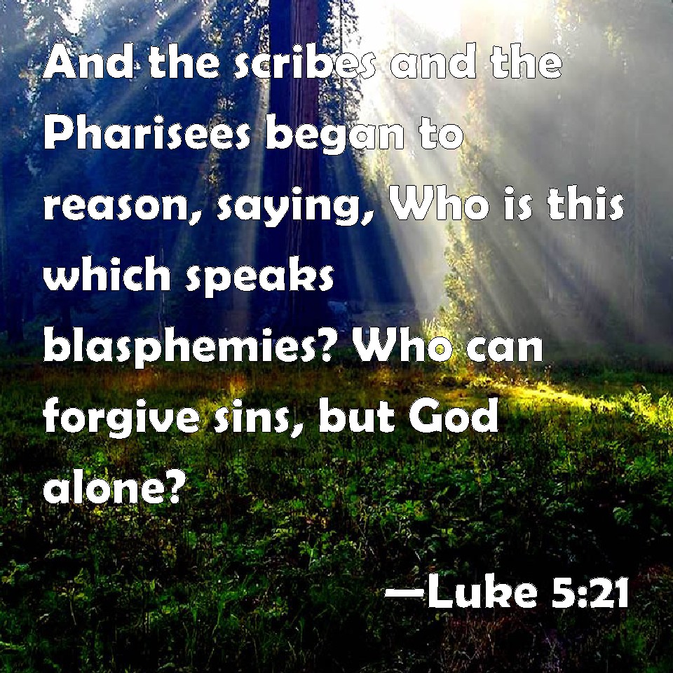 Choose a Background Luke 5:21 And the scribes and the Pharisees began to reason, saying, Who is this which speaks blasphemies? Who can forgive sins, but God alone? KJV: And the scribes and the Pharisees began to reason, saying, Who is this which speaketh blasphemies? Who can forgive sins, but God alone? DRB: And the scribes and Pharisees began to think, saying: Who is this who speaketh blasphemies? Who can forgive sins, but God alone? DBT: And the scribes and the Pharisees began to reason in their minds, saying, Who is this who speaks blasphemies? Who is able to forgive sins but God alone? ERV: And the scribes and the Pharisees began to reason, saying, Who is this that speaketh blasphemies? Who can forgive sins, but God alone? WBT: And the scribes and the Pharisees began to reason, saying, Who is this who speaketh blasphemies? Who can forgive sins but God alone? WEB: The scribes and the Pharisees began to reason, saying, "Who is this that speaks blasphemies? Who can forgive sins, but God alone?" YLT: And the scribes and the Pharisees began to reason, saying, 'Who is this that doth speak evil words? who is able to forgive sins, except God only?'Links Luke 5:21 NIV • Luke 5:21 NLT • Luke 5:21 ESV • Luke 5:21 NASB • Luke 5:21 KJV • Luke 5:21 Interlinear • Luke 5:21 Commentaries • Luke 5:21 Parallel Texts • Luke 5:21 Bible Apps • Luke 5:21 Parallel • Bible Hub |