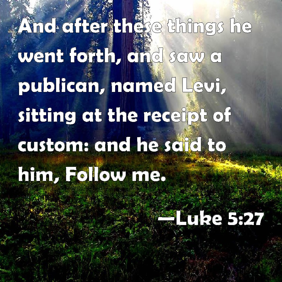 Choose a Background Luke 5:27 And after these things he went forth, and saw a publican, named Levi, sitting at the receipt of custom: and he said to him, Follow me. KJV: And after these things he went forth, and saw a publican, named Levi, sitting at the receipt of custom: and he said unto him, Follow me. DRB: And after these things he went forth, and saw a publican named Levi, sitting at the receipt of custom, and he said to him: Follow me. DBT: And after these things he went forth and saw a tax-gatherer, Levi by name, sitting at the receipt of taxes, and said to him, Follow me. ERV: And after these things he went forth, and beheld a publican, named Levi, sitting at the place of toll, and said unto him, Follow me. WBT: And after these things he went forth, and saw a publican named Levi, sitting at the receipt of custom: and he said to him, Follow me. WEB: After these things he went out, and saw a tax collector named Levi sitting at the tax office, and said to him, "Follow me!" YLT: And after these things he went forth, and beheld a tax-gatherer, by name Levi, sitting at the tax-office, and said to him, 'Be following me;'Links Luke 5:27 NIV • Luke 5:27 NLT • Luke 5:27 ESV • Luke 5:27 NASB • Luke 5:27 KJV • Luke 5:27 Interlinear • Luke 5:27 Commentaries • Luke 5:27 Parallel Texts • Luke 5:27 Bible Apps • Luke 5:27 Parallel • Bible Hub |