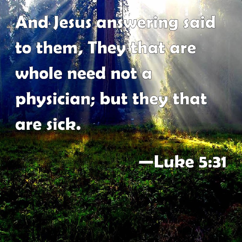 Choose a Background Luke 5:31 And Jesus answering said to them, They that are whole need not a physician; but they that are sick. KJV: And Jesus answering said unto them, They that are whole need not a physician; but they that are sick. DRB: And Jesus answering, said to them: They that are whole, need not the physician: but they that are sick. DBT: And Jesus answering said to them, They that are in sound health have not need of a physician, but those that are ill. ERV: And Jesus answering said unto them, They that are whole have no need of a physician; but they that are sick. WBT: And Jesus answering, said to them, They that are well need not a physician; but they that are sick. WEB: Jesus answered them, "Those who are healthy have no need for a physician, but those who are sick do. YLT: And Jesus answering said unto them, 'They who are well have no need of a physician, but they that are ill:Links Luke 5:31 NIV • Luke 5:31 NLT • Luke 5:31 ESV • Luke 5:31 NASB • Luke 5:31 KJV • Luke 5:31 Interlinear • Luke 5:31 Commentaries • Luke 5:31 Parallel Texts • Luke 5:31 Bible Apps • Luke 5:31 Parallel • Bible Hub |