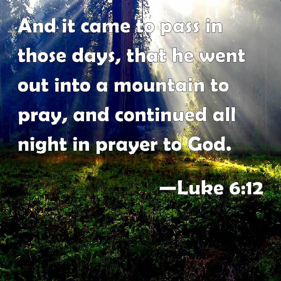 Choose a Background Luke 6:12 And it came to pass in those days, that he went out into a mountain to pray, and continued all night in prayer to God. KJV: And it came to pass in those days, that he went out into a mountain to pray, and continued all night in prayer to God. DRB: And it came to pass in those days, that he went out into a mountain to pray, and he passed the whole night in the prayer of God. DBT: And it came to pass in those days that he went out into the mountain to pray, and he spent the night in prayer to God. ERV: And it came to pass in these days, that he went out into the mountain to pray; and he continued all night in prayer to God. WBT: And it came to pass in those days, that he went out to a mountain to pray, and continued all night in prayer to God. WEB: It happened in these days, that he went out to the mountain to pray, and he continued all night in prayer to God. YLT: And it came to pass in those days, he went forth to the mountain to pray, and was passing the night in the prayer of God,Links Luke 6:12 NIV • Luke 6:12 NLT • Luke 6:12 ESV • Luke 6:12 NASB • Luke 6:12 KJV • Luke 6:12 Interlinear • Luke 6:12 Commentaries • Luke 6:12 Parallel Texts • Luke 6:12 Bible Apps • Luke 6:12 Parallel • Bible Hub |