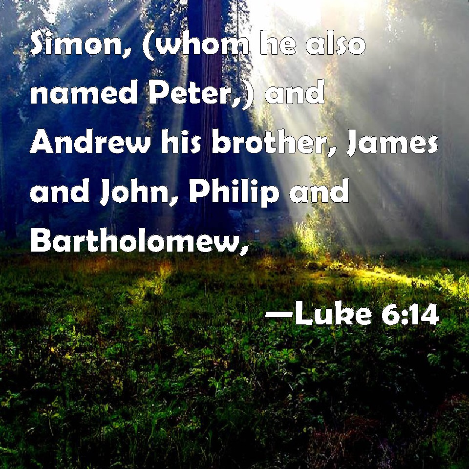 Choose a Background Luke 6:14 Simon, (whom he also named Peter,) and Andrew his brother, James and John, Philip and Bartholomew, KJV: Simon, (whom he also named Peter,) and Andrew his brother, James and John, Philip and Bartholomew, DRB: Simon, whom he surnamed Peter, and Andrew his brother, James and John, Philip and Bartholomew, DBT: Simon, to whom also he gave the name of Peter, and Andrew his brother, and James and John, and Philip and Bartholomew, ERV: Simon, whom he also named Peter, and Andrew his brother, and James and John, and Philip and Bartholomew, WBT: Simon (whom he also named Peter) and Andrew his brother, James and John, and Philip and Bartholomew, WEB: Simon, whom he also named Peter; Andrew, his brother; James; John; Philip; Bartholomew; YLT: (Simon, whom also he named Peter, and Andrew his brother, James and John, Philip and Bartholomew,Links Luke 6:14 NIV • Luke 6:14 NLT • Luke 6:14 ESV • Luke 6:14 NASB • Luke 6:14 KJV • Luke 6:14 Interlinear • Luke 6:14 Commentaries • Luke 6:14 Parallel Texts • Luke 6:14 Bible Apps • Luke 6:14 Parallel • Bible Hub |