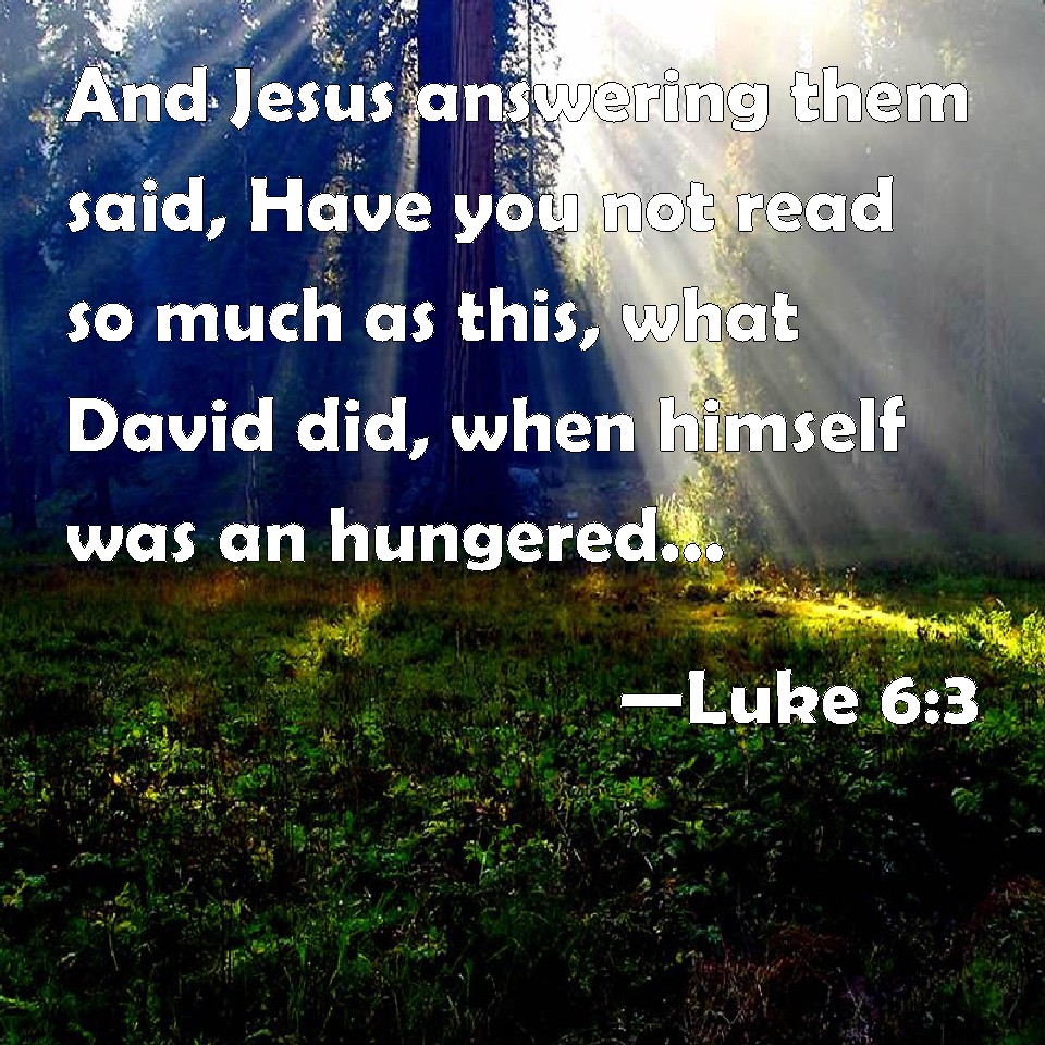 Choose a Background Luke 6:3 And Jesus answering them said, Have you not read so much as this, what David did, when himself was an hungered, and they which were with him; KJV: And Jesus answering them said, Have ye not read so much as this, what David did, when himself was an hungred, and they which were with him; DRB: And Jesus answering them, said: Have you not read so much as this, what David did, when himself was hungry, and they that were with him: DBT: And Jesus answering said to them, Have ye not read so much as this, what David did when he hungered, he and those who were with him, ERV: And Jesus answering them said, Have ye not read even this, what David did, when he was an hungred, he, and they that were with him; WBT: And Jesus answering them, said, Have ye not read so much as this, what David did, when himself was hungry, and they who were with him; WEB: Jesus, answering them, said, "Haven't you read what David did when he was hungry, he, and those who were with him; YLT: And Jesus answering said unto them, 'Did ye not read even this that David did, when he hungered, himself and those who are with him,Links Luke 6:3 NIV • Luke 6:3 NLT • Luke 6:3 ESV • Luke 6:3 NASB • Luke 6:3 KJV • Luke 6:3 Interlinear • Luke 6:3 Commentaries • Luke 6:3 Parallel Texts • Luke 6:3 Bible Apps • Luke 6:3 Parallel • Bible Hub |