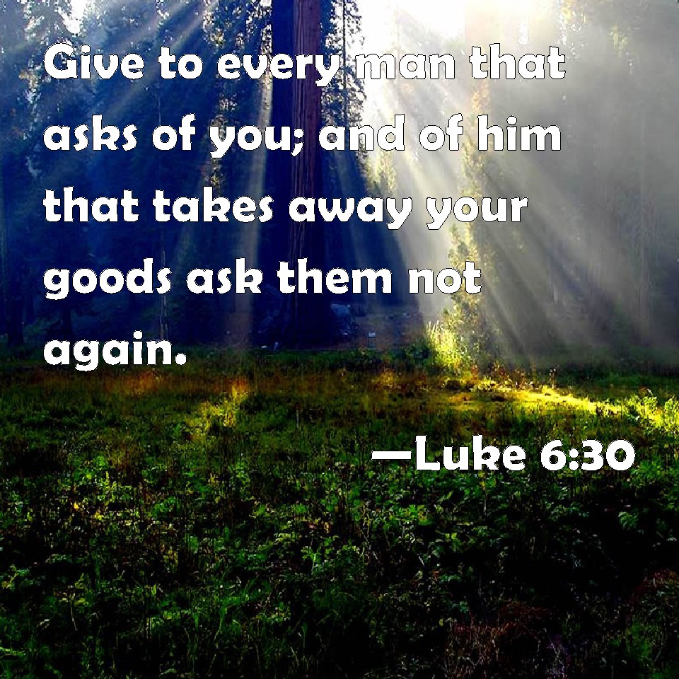 Luke 6:30 Give to every man that asks of you; and of him that takes away your goods ask them not again.